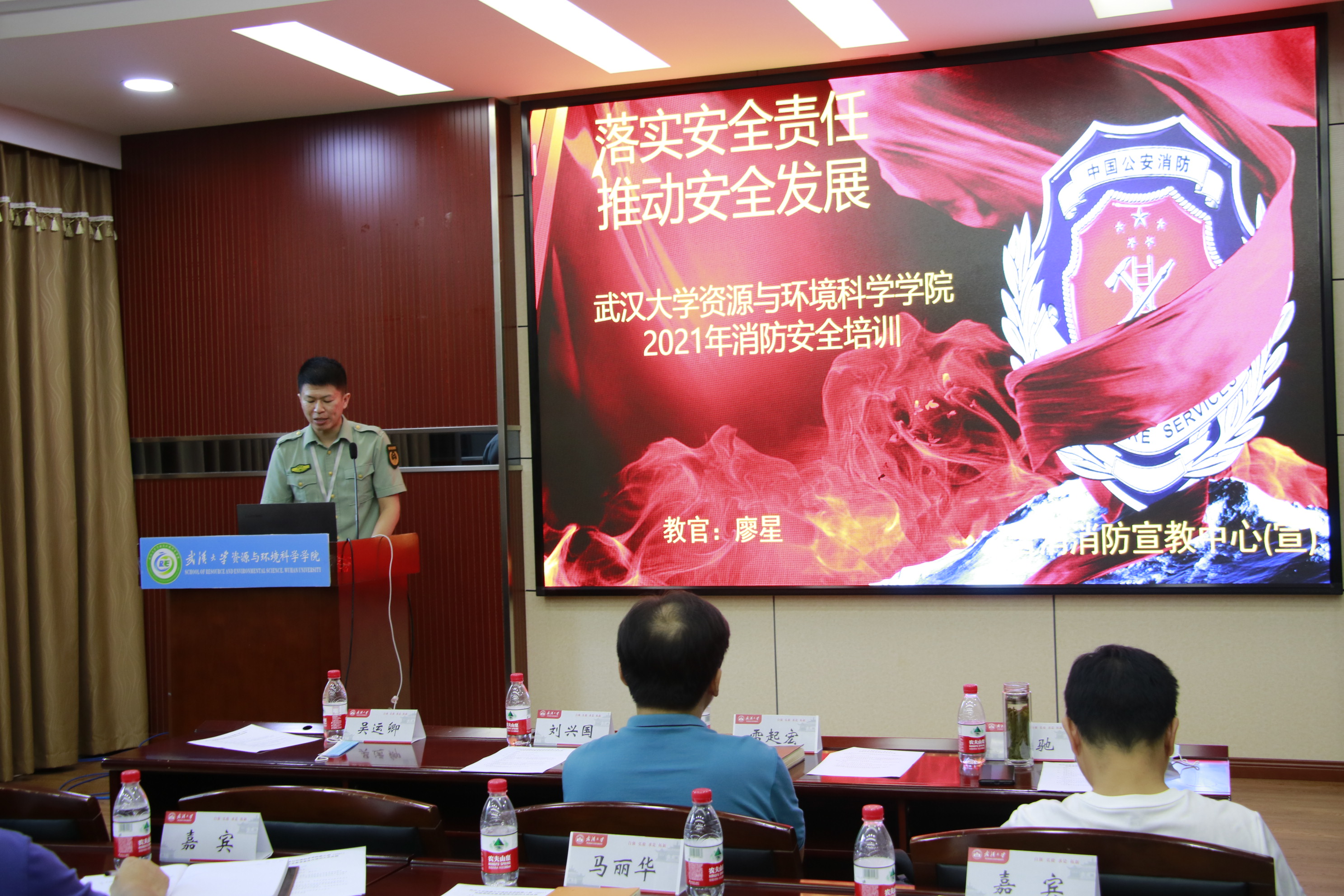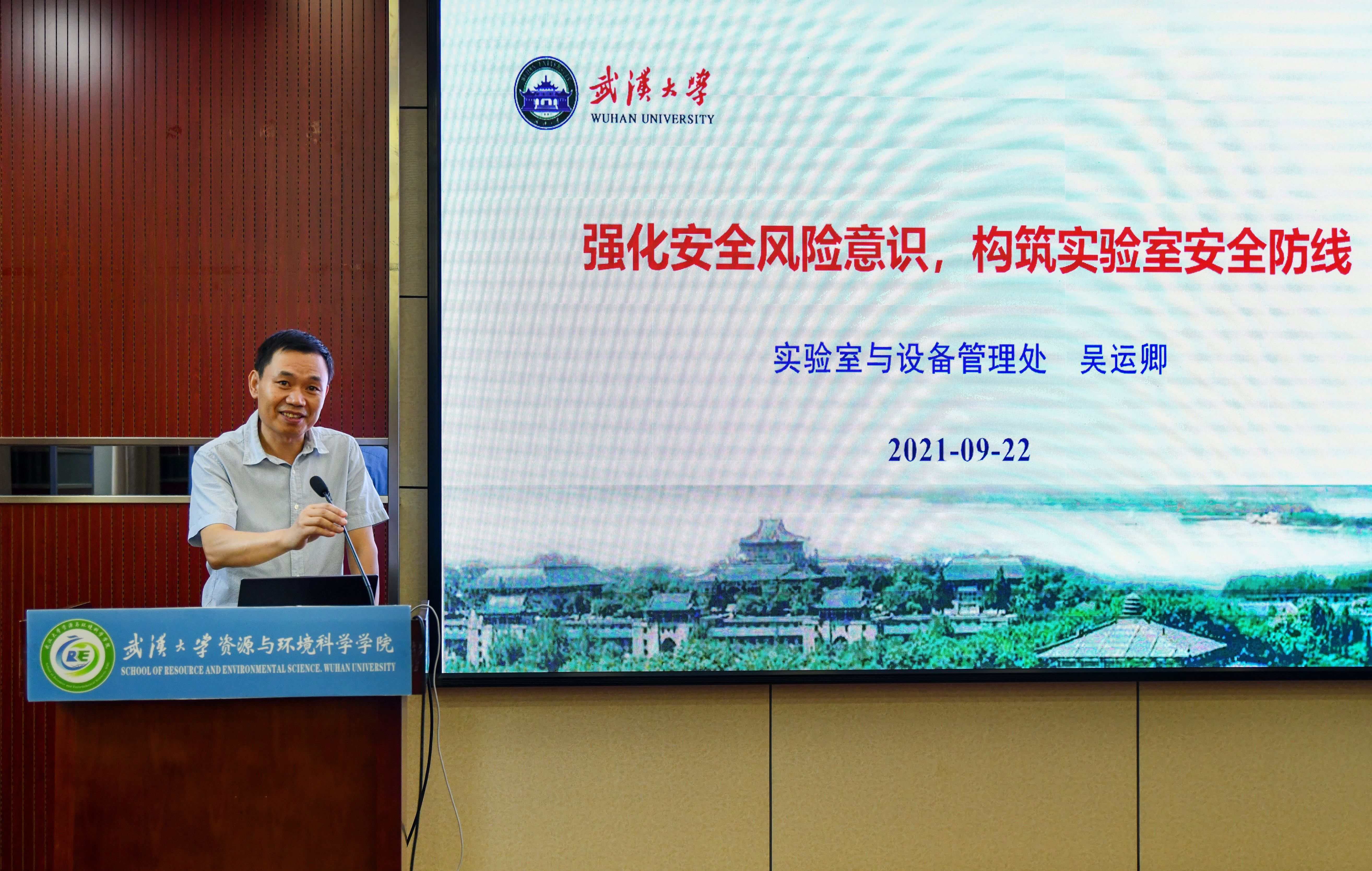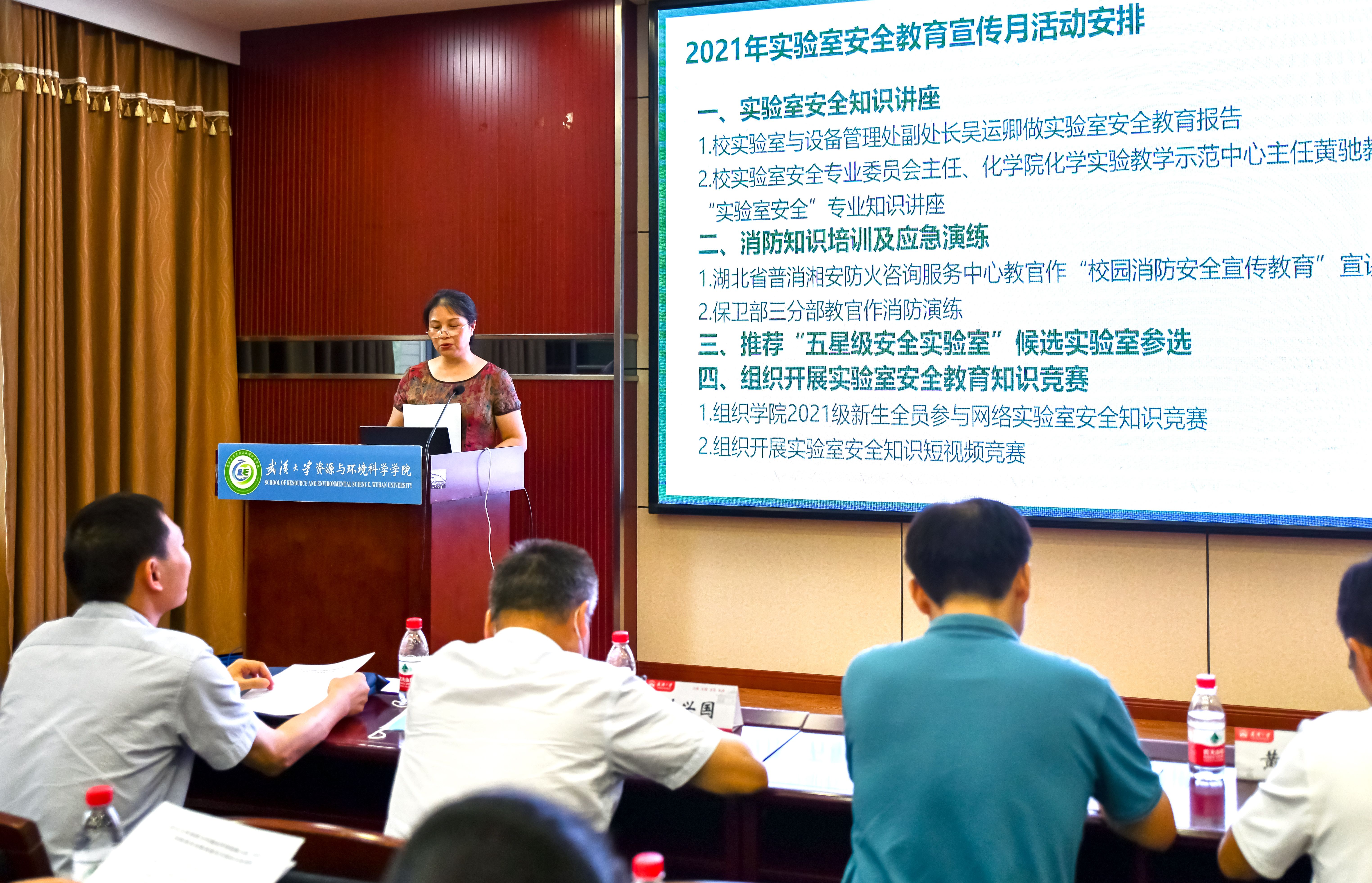 2021年9月22日下午15:00,资环学院于信息学部7号楼220报告厅召开第六届(2021)实验室安全教育宣传月培训大会,出席会议的人员有党委书记刘兴国老师、院党委副书记雷起宏老师、校实验室与设备管理处副处长吴运卿老师、校实验室安全专业委员会主任黄驰教授、湖北省普消湘安防火咨询服务中心教官、研究生辅导员马丽华老师、李韩老师以及全院环境类实验中心科研实验室安全责任人和2021级环境类专业研究生。培训大会由学院分管实验室安全副院长梁玉兰老师主持。