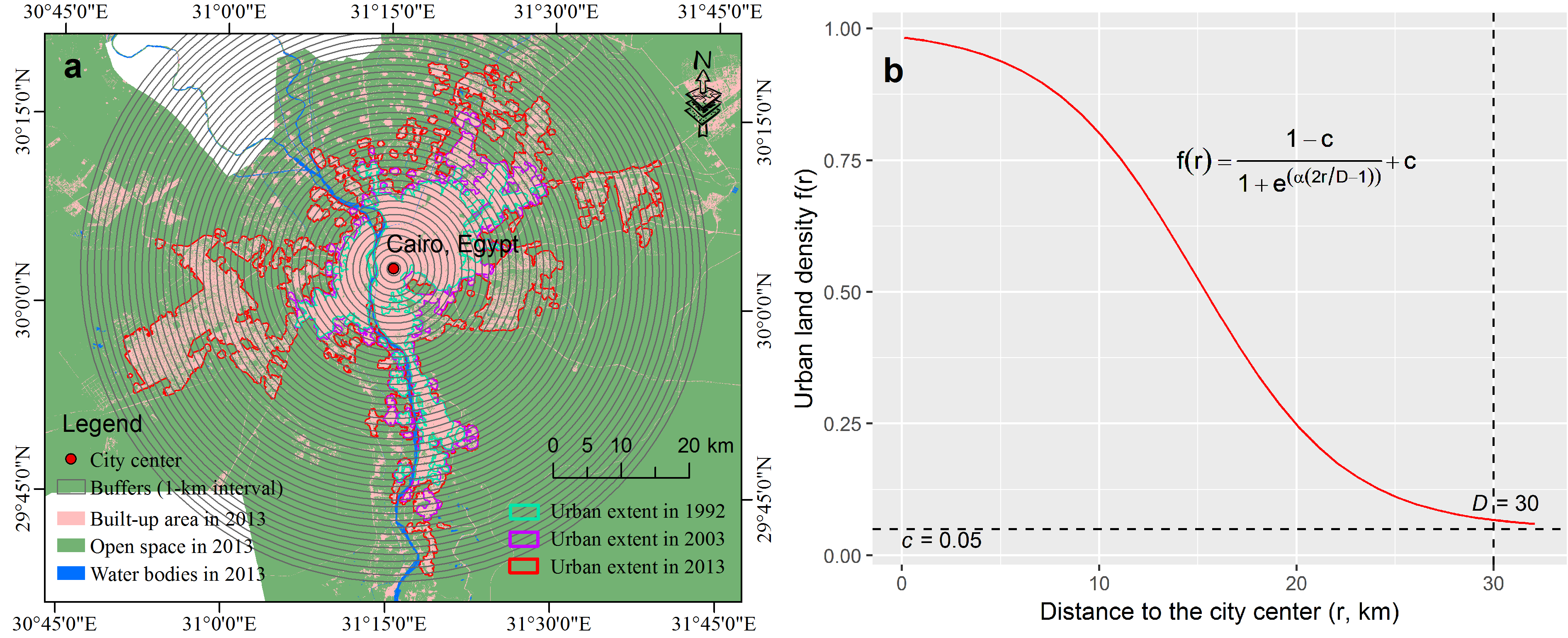 图1 城市建设用地的圈层划分及城市土地密度函数(Jiao, 2015; Xu et al., 2019)