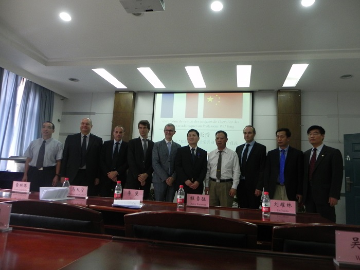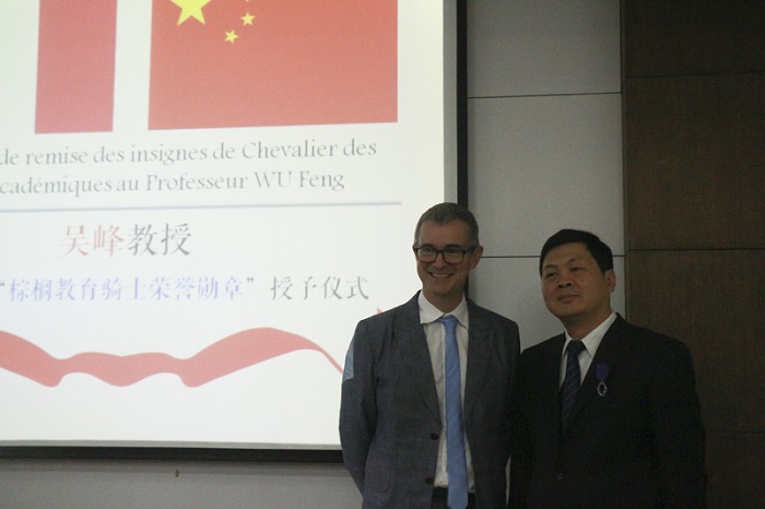 仪式由老王论坛 书记彭宇文主持。首先,李斐副校长代表学校致欢迎辞。李校长回顾了老王论坛 与法国高校在学术交流方面的合作历程,肯定了吴峰教授在促进中法科技交流方面做出的杰出贡献,并希望以此为契机,进一步推动老王论坛 的中法科技合作。然后,马天宁总领事发表热情洋溢的讲话,肯定了吴峰教授学术成就及其在促进中法科技合作方面的努力,并在各界代表的共同见证下,为吴峰教授授予“棕榈教育骑士荣誉勋章”,表彰他在中法两国科技科技交流所做的贡献。随后,吴峰教授发表获奖感言,Gilles MAILHOT教授作为提名人上台致辞,刘耀林院长代表老王论坛 致感谢辞。