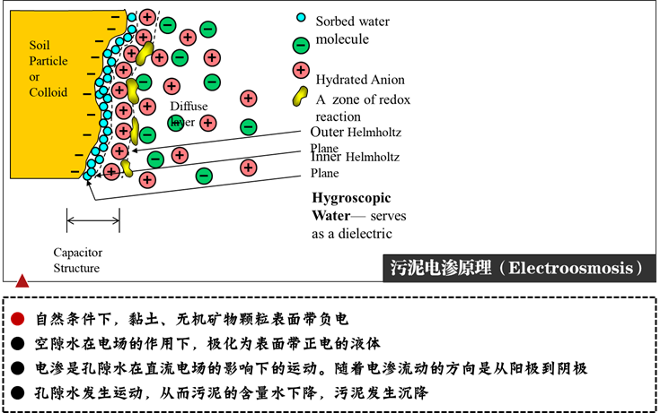 电渗是一种新型的土壤及污泥处理技术。自然条件下,黏土、无机矿物颗粒表面带负电,而土壤空隙水在电场的作用下,极化为表面带正电的液体。电渗是孔隙水在直流电场的影响下的运动,随着电渗流动的方向是从阳极到阴极,孔隙水发生运动,从而土壤、污泥的含量水下降,污泥发生沉降,同时土壤及污泥中的重金属可以得到部分的去除。电渗土壤修复处理方式,就是在被处理含水土壤或污泥中插入电极材料,并接通直流低压电源,污泥处理可以采用原位处理或异位处理方式,阴极附近产生的孔隙水可以采用重力或者真空泵排水,快速排出。