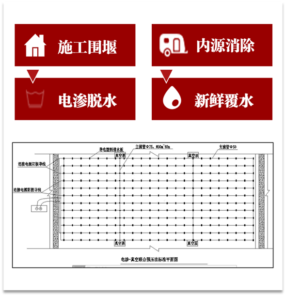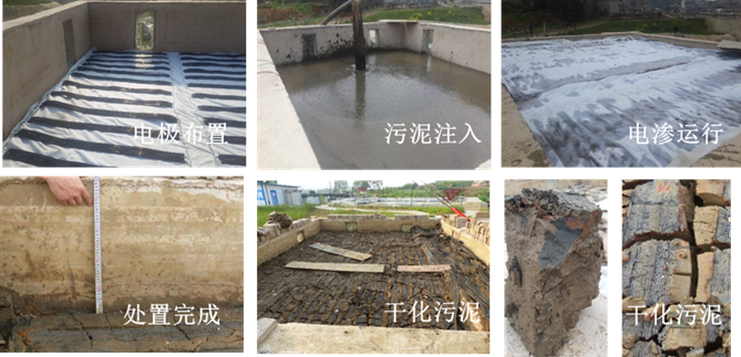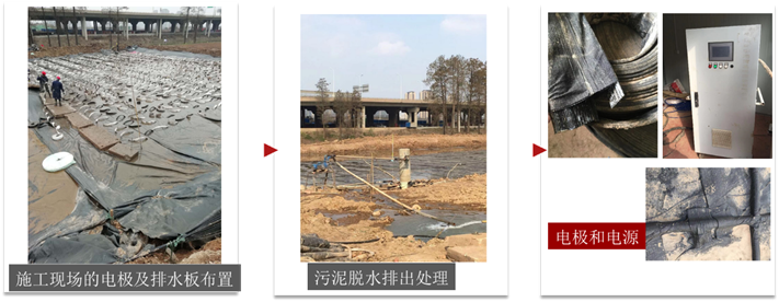 污泥电渗处置技术案例。湖北省武汉市世界军运会黄家湖环境综合整治工程。黄家湖环境综合整治工程是武汉市为世界军运会召开而进行的重点工程,工程内容包括黄家湖黑臭河道清淤,产生清淤污泥达到2万立方以上,需要采用快速、高效、安全的污泥固化和稳定化技术,实现原位固化利用。采用电渗排水处理,经过十二天的处理,两万方淤泥含水量降低至50%左右,淤泥下沉40cm。达到进一步作业和资源化利用的要求。为工程项目方节省成本160万元,现场实施工程图如下: