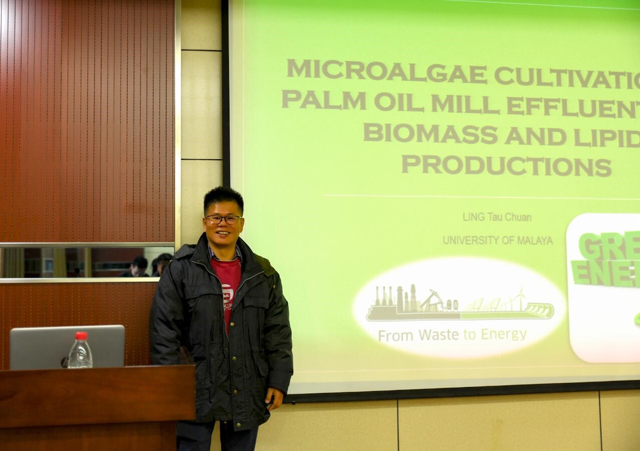 紧接着,Tau Chuan LING教授介绍了用微藻制取生物燃料的必要性和未来前景。他结合马来西亚的情况,详细说明了用棕榈油厂废水培养微藻,构建菌藻共生系统处理废水的良好效果。他从棕榈油厂废水的水质、培养微藻的生物量、预处理措施等细节方面完整说明了该菌藻共生系统的运行情况。