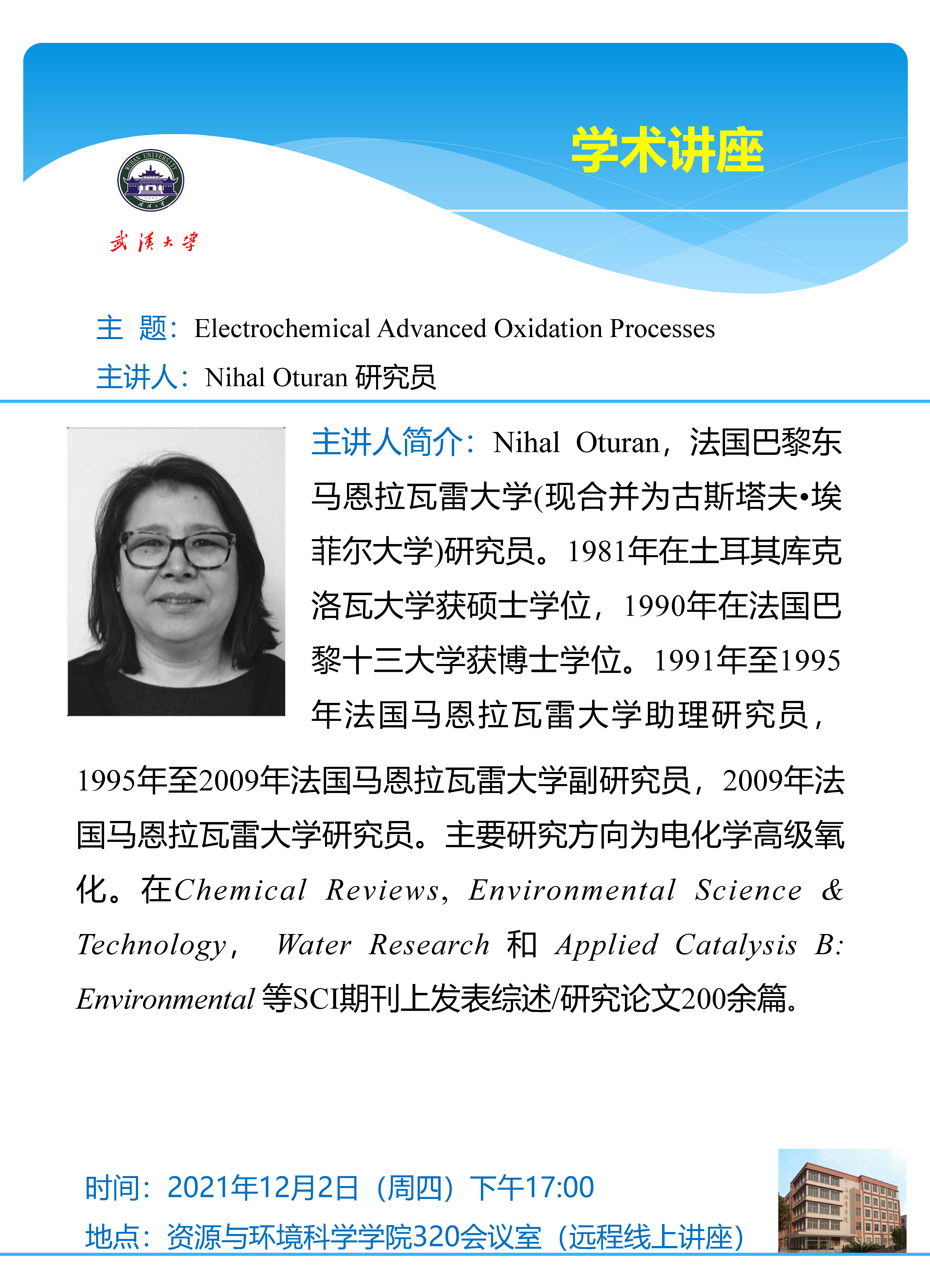 12月2日下午法国古斯塔夫•埃菲尔大学Nihal Oturan研究员:Electrochemical Advanced Oxidation Processes