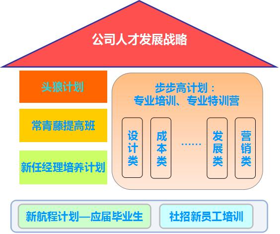 招商地产非常重视员工培养,设计了体系健全、内容多样的培训体系。对于新进入公司的员工,公司提供应届生培养的新航程计划和社会招聘新员工培训来帮助“招商新兵”融入集体。对于老员工,公司根据发展通道分管理通道和专业通道分别提供“头狼计划”、“常青藤计划”、“新任经理培养计划”等领导力培训和按岗位职能划分的专业能力培训。2014年已规划的培训项目有14个系列,覆盖应届生、社招新员工、专业线员工和管理线人员。