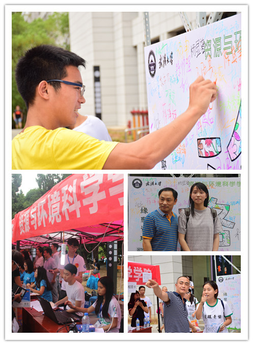 9月6日是学校2016级新生入学报到的第一天,2016年迎新工作进入现场阶段。今年的迎新在新建成投入使用的信息学部图书馆门前广场进行。学院特别为新生表达入校之情,制作了“缘聚资环,共绘珞珈”的手绘板,受到了学生和家长的欢迎。校长李晓红先后两次来到学院迎新现场,并应邀用蜡笔为一朵花瓣增色,与新生一起共绘“珞珈”。