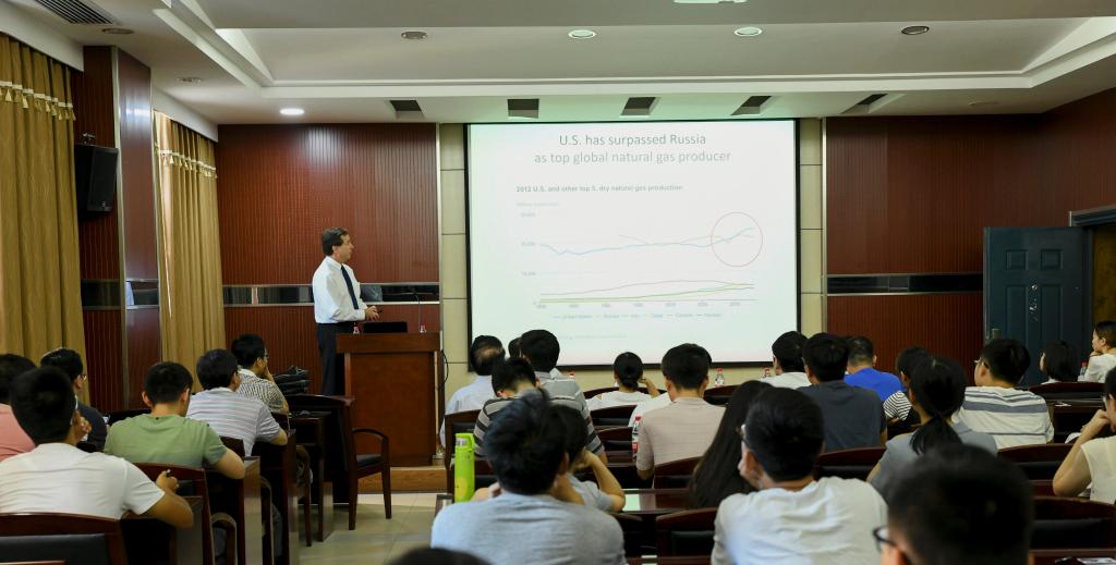 Prof. Allen has engaged in air quality research for years, and served as the director of U.S. Environmental Protection Agency Scientific Advisory Board. He has led multiple air quality management and control projects, which have a significant influence on the policy-making in U.S. Prof. Allen first gave a speech titled Air Quality Impacts of Expanded Oil and Natural Gas Production in the United States to the faculty and students of SRES. In the speech, Prof. Allen compared Chinese energy structure and shale gas distribution to U.S. He also shared the environmental protection policy and measures in the shale gas development, and the achievements on the control of the greenhouse gas emission, the conservation of water resources and the improvement of energy efficiency.