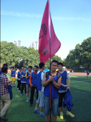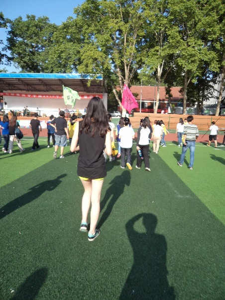 跟着队伍的旗帜,我们要去接力啦!哈哈,天气正好,天真蓝。看!前面那位同学换上轻便的短装,看起来准备很充分的样子呢。嘤嘤嘤,大家要加油哦!