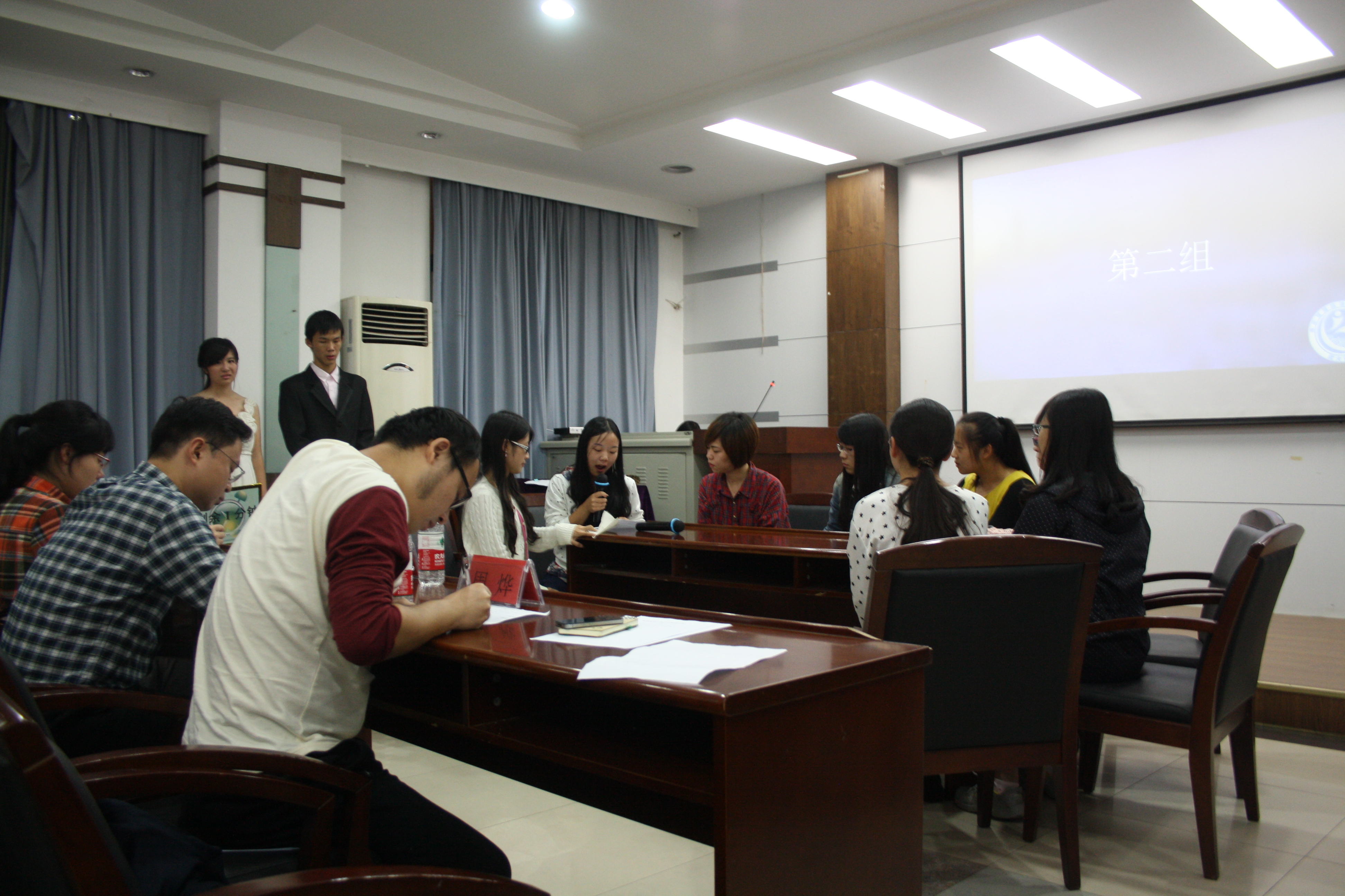 比赛采取无领导小组讨论的形式,具体的比赛流程如下:每组选出一个组长并抽取情景题然后进行讨论分析,并在相应的时间之内完成讨论,评委根据选手表现进行提问并相应打分。这是一个充分考验选手反应及思考能力的比赛,而且题目全部为企业招聘所采用的真题,连评委都表示这些题目有难度。所有小组的比赛结束后,评委依次对每组比赛的过程进行了复盘,对每名选手的表现都进行了点评,并提供了参考意见。