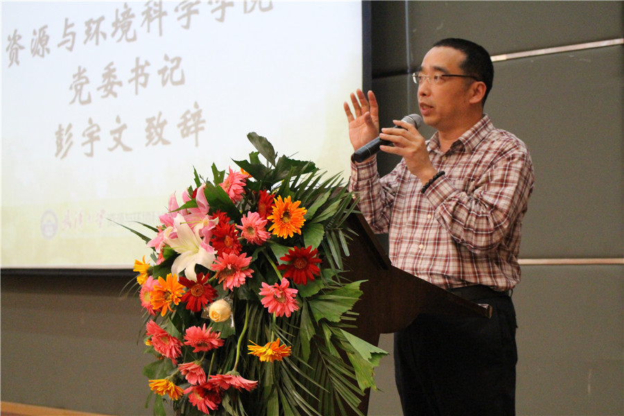在工作人员计票的过程中,全程参与了大会的院党委书记彭宇文书记上台作了发言。他指出资环院的专业覆盖面广,综合性强,这是资环院的一大特色与优势。他鼓励同学们认真学习,在学好专业知识的同时努力培养人文素养,成长为综合性的新型人才。同时他向同学们提出了几点要求与希望,包括适度远离手机,心中始终要有定力等,殷切期盼之情溢于言表。