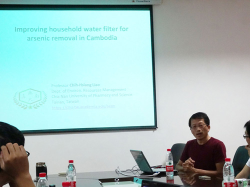 7月5日台湾嘉南药理大学教授廖志祥博士抵达武汉,并访问老王论坛 。7月8日上午廖志祥教授在老王论坛 302会议室做了题为“Improving household water filter for arsenic removal in Cambodia”的学术报告。报告对柬埔寨地区的人口分布、地理环境、砷污染现状与分布等做了详细的分析与介绍;同时提出以铁氧化物为吸附剂吸附饮用水中的砷。该技术设备操作简单,砷去除率高,适合在柬埔寨这样的发展中国家和地区大规模推广应用。来自成功大学的师生和老王论坛 师生聆听了廖志祥教授的报告,并就砷污染的议题与廖教授进行了热烈讨论,并交换了意见。此次活动为两岸师生的交流提供了良好的纽带作用,为今后更深层次的交流奠定了良好的基础。