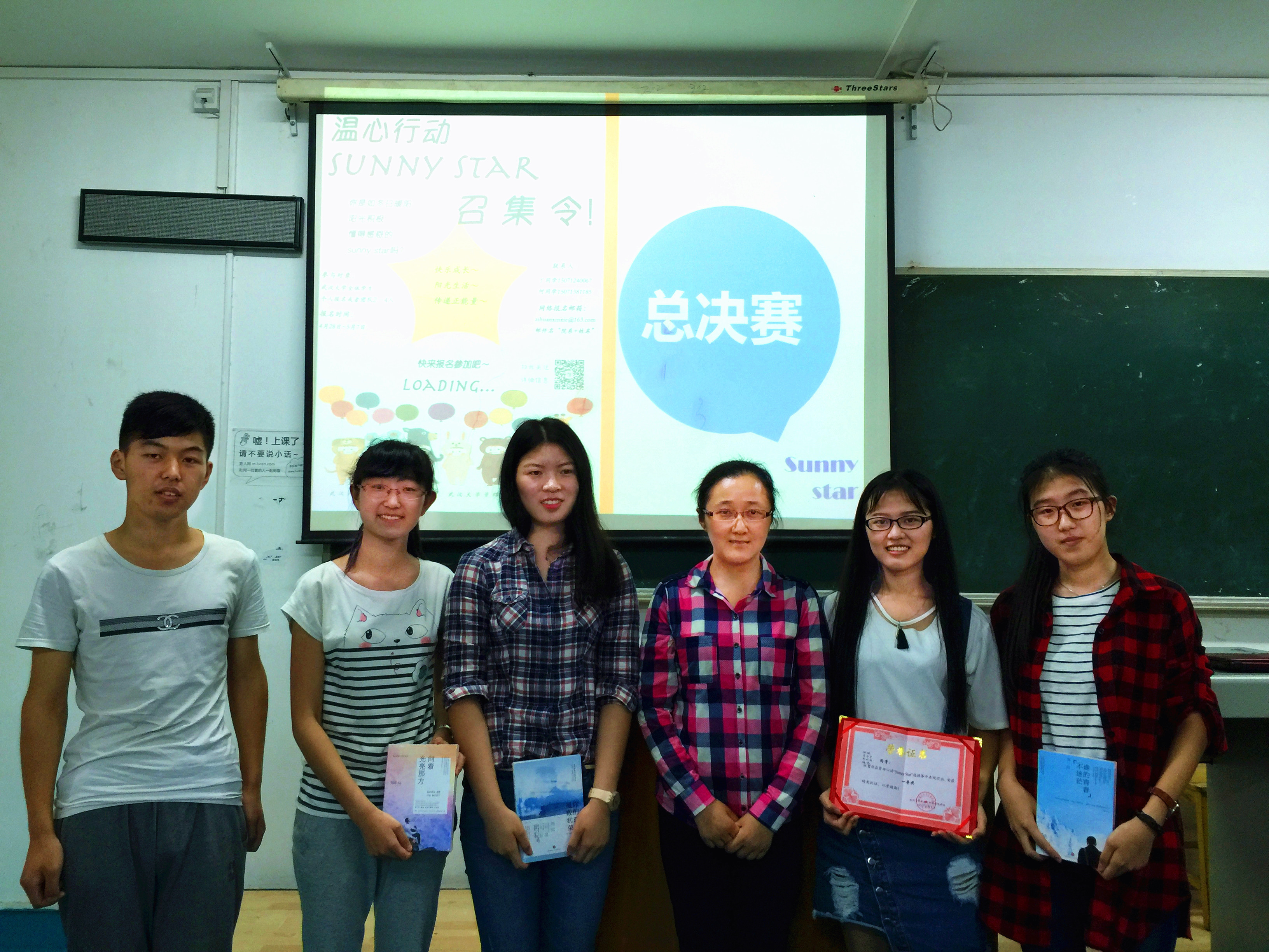 比赛环节结束后,由第四届“Sunny Star”一等奖得主冯璐玮同学做总结。她认为,“Sunny Star”评选给了很多阳光积极的同学一个展示自己、带动他人的机会,通过这样的活动,也让她认识了更多阳光、乐观的同学,感受到了生活中的正能量无处不在的,每个人都可以是阳光正能量的传递者。不管遇到怎样的困难和挫折,只要我们保持乐观、积极的态度,终会成为最好的自己。最后,活泼、友爱、阳光的Sunny honey姐妹花组合摘得比赛一等奖。由评委们给获奖选手颁奖,奖品是心理励志读物。