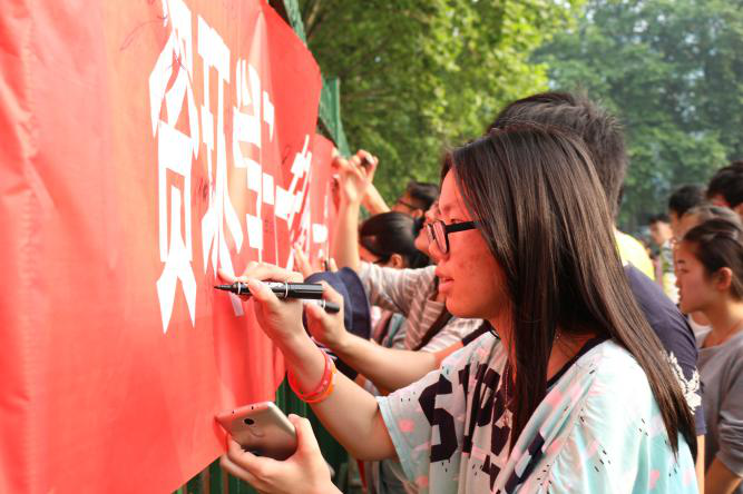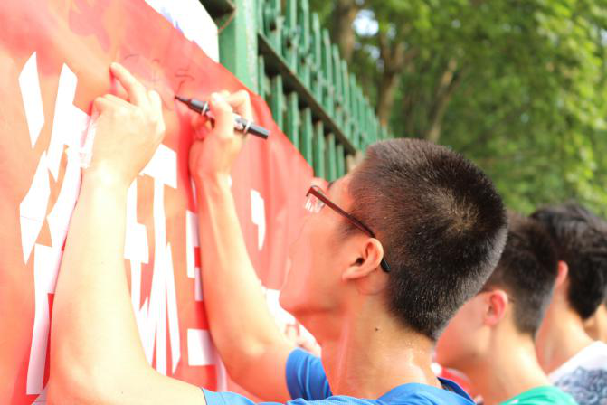 跑完步的同学们纷纷在红色条幅签名。