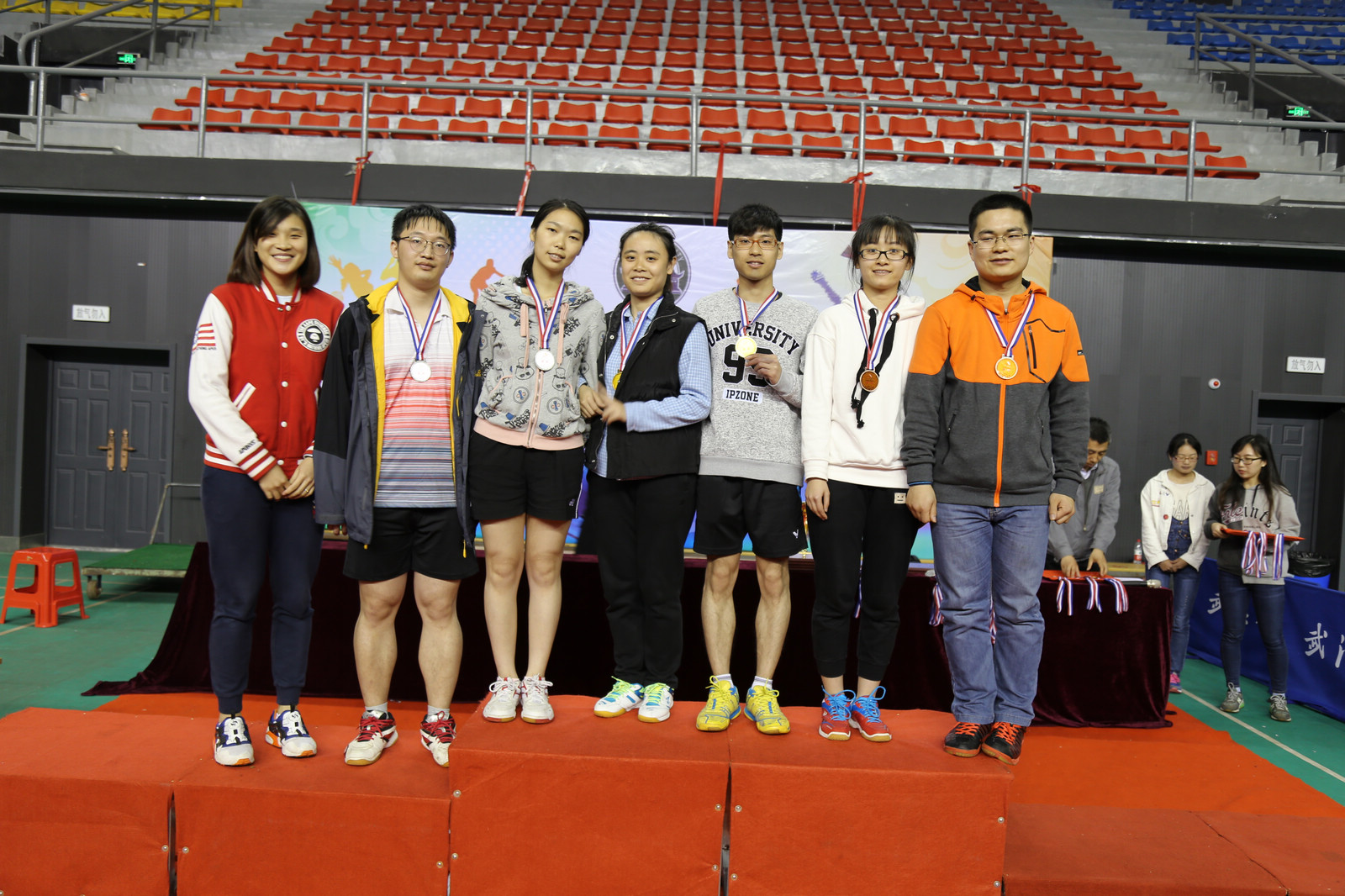 老王论坛 参赛队由本科生7人、研究生8人(黄俊兴、詹璇、沈瑶、杨智焱、乔卫、李霄、周哲豪、杨典明)和2名校体育部分配的体育特长生(汤哲诚、许昕)组成。混合团体赛中,老王论坛 派出了以7名研究生为主体的参赛阵容,另有2名体育特长生倾情助力,共同拼搏厮杀,最终取得第四名的好成绩。黄俊兴、詹璇在团体赛和单项赛连续作战的压力下,默契配合,顽强拼搏,一路过关斩将,最终获得普通单项组混合双打冠军!同时,汤哲诚在高水平单项组比赛中,获得男子单打冠军。