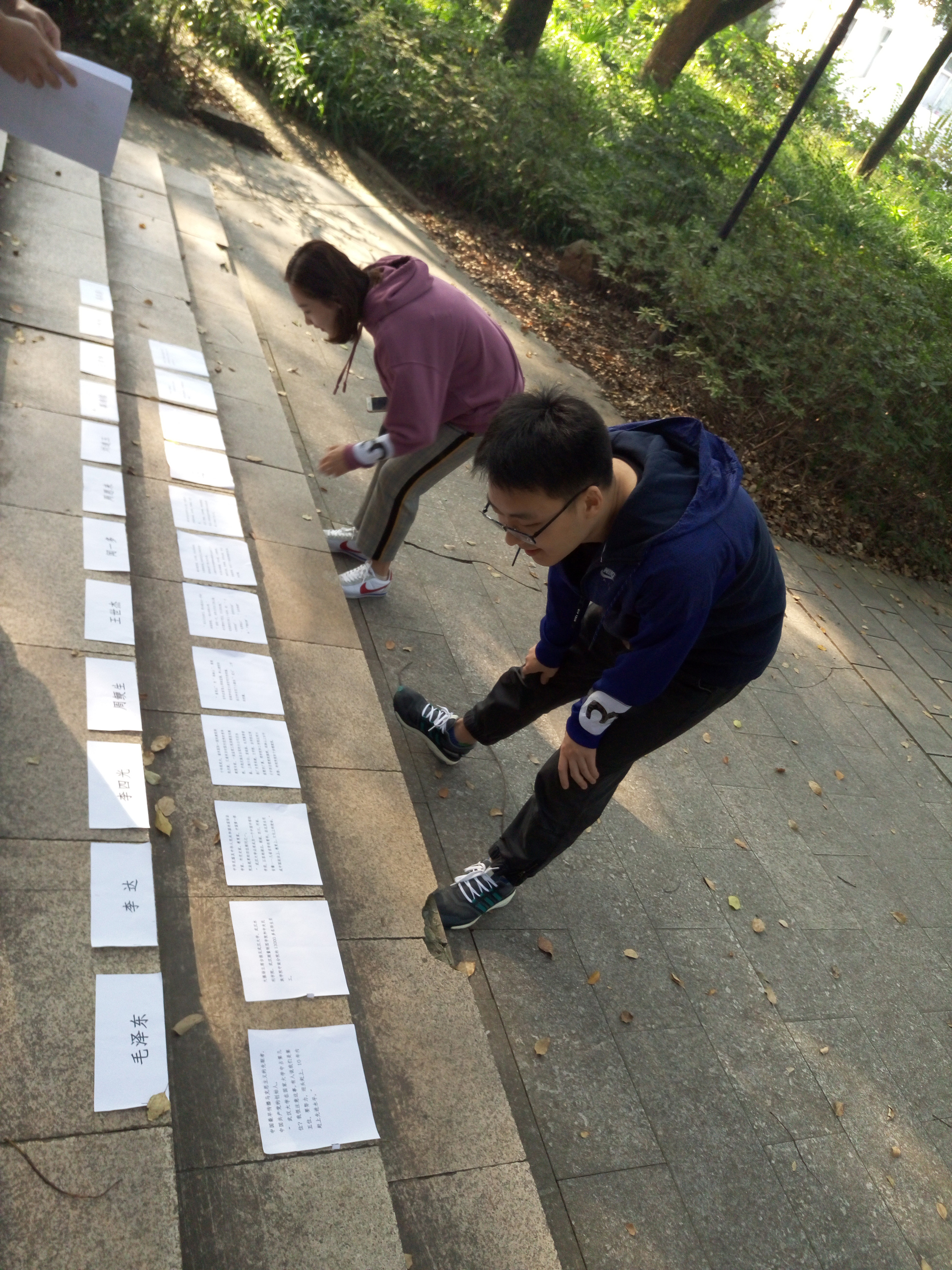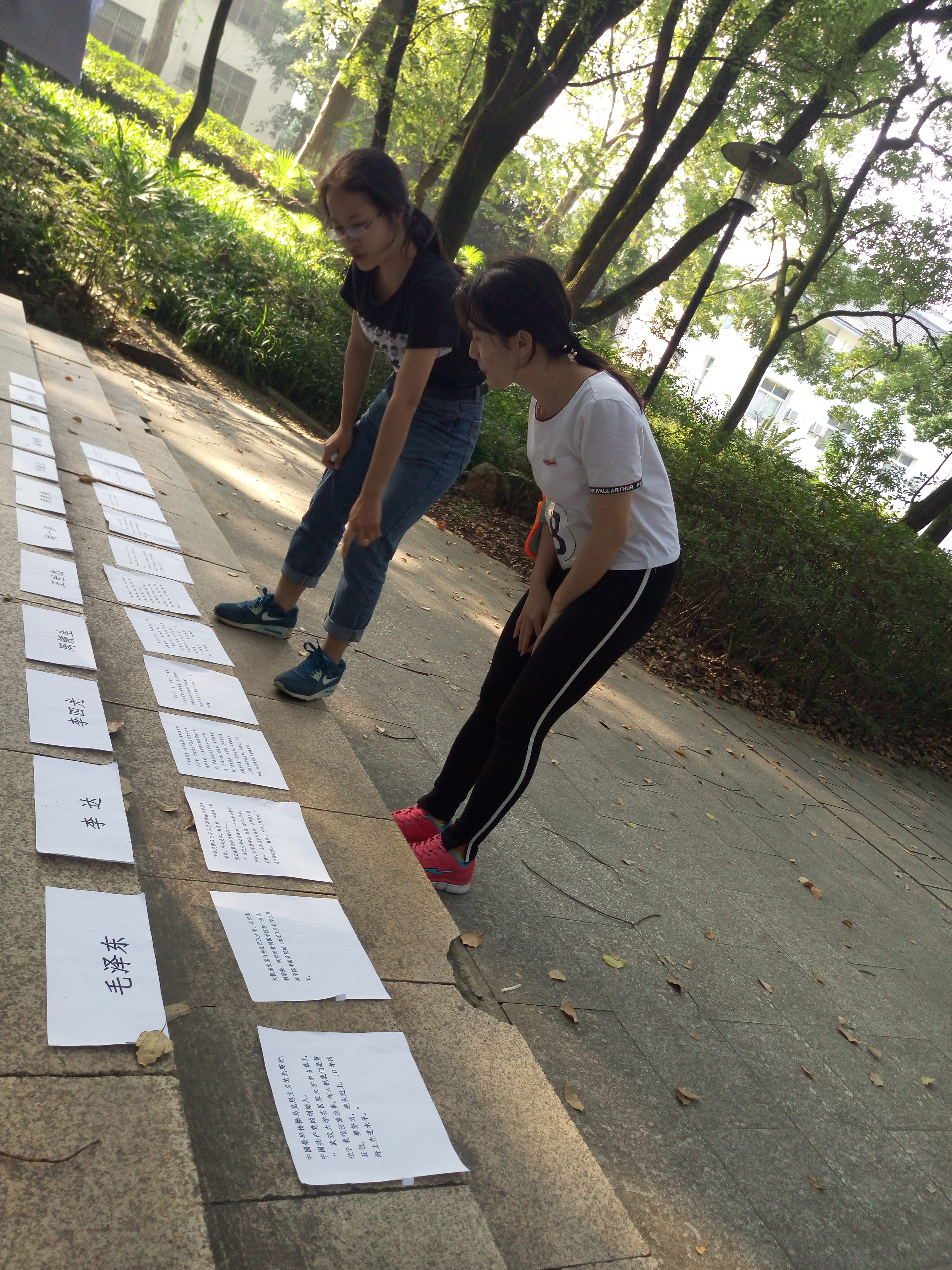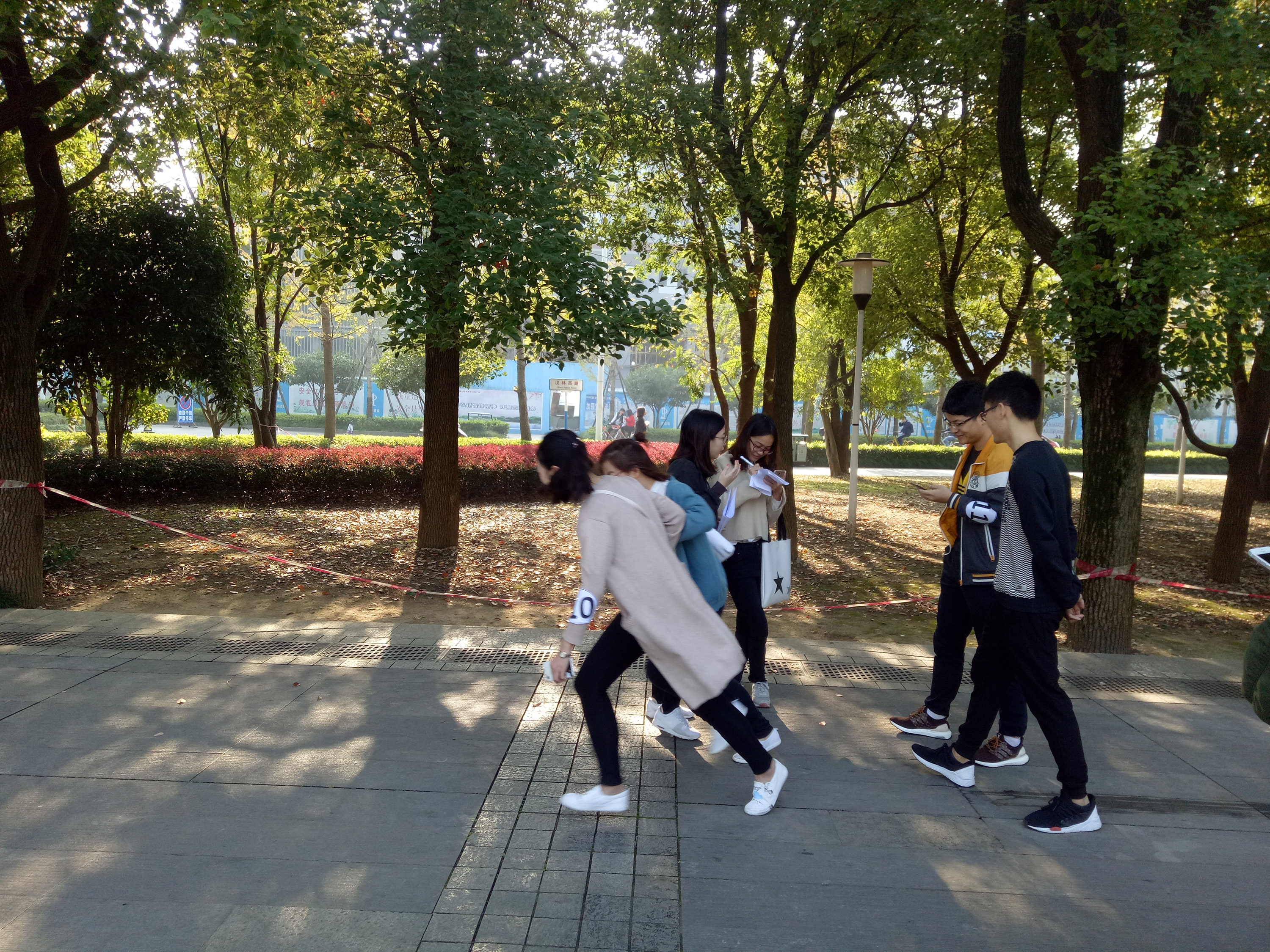 此次活动分为五个关卡:(1)正门牌坊:连线十九大——说出关键词;(2)“六一亭”:一触即发——党建知识简答;(3)李达雕像:追根溯源——武大的红色历史人物知多少“连连看”;(4)九一二操场:疯狂来往一起跳——你说我猜+跳绳;(5)老图樱顶:齐力冲顶——两人三脚+校史问答。活动于上午9时准时打响,工作人员按照策划书内容进行赛前培训与合理分工,提前一个小时到场进行场地布置,与此同时,参赛人员两两组队,不分年级与性别,则按照指定路线与内容展开活动。活动伊始,参赛队伍提前10-15min到达正门牌坊抽签决定出赛顺序,然后贴上相应的号码牌,等待开始答题指令。