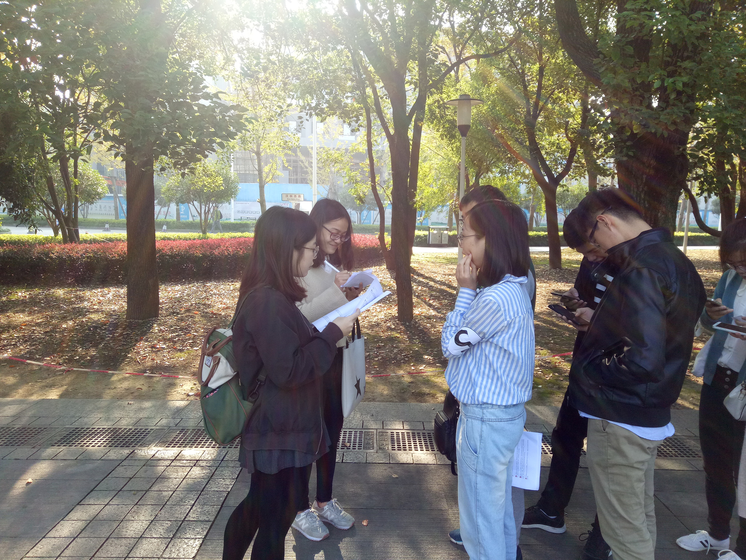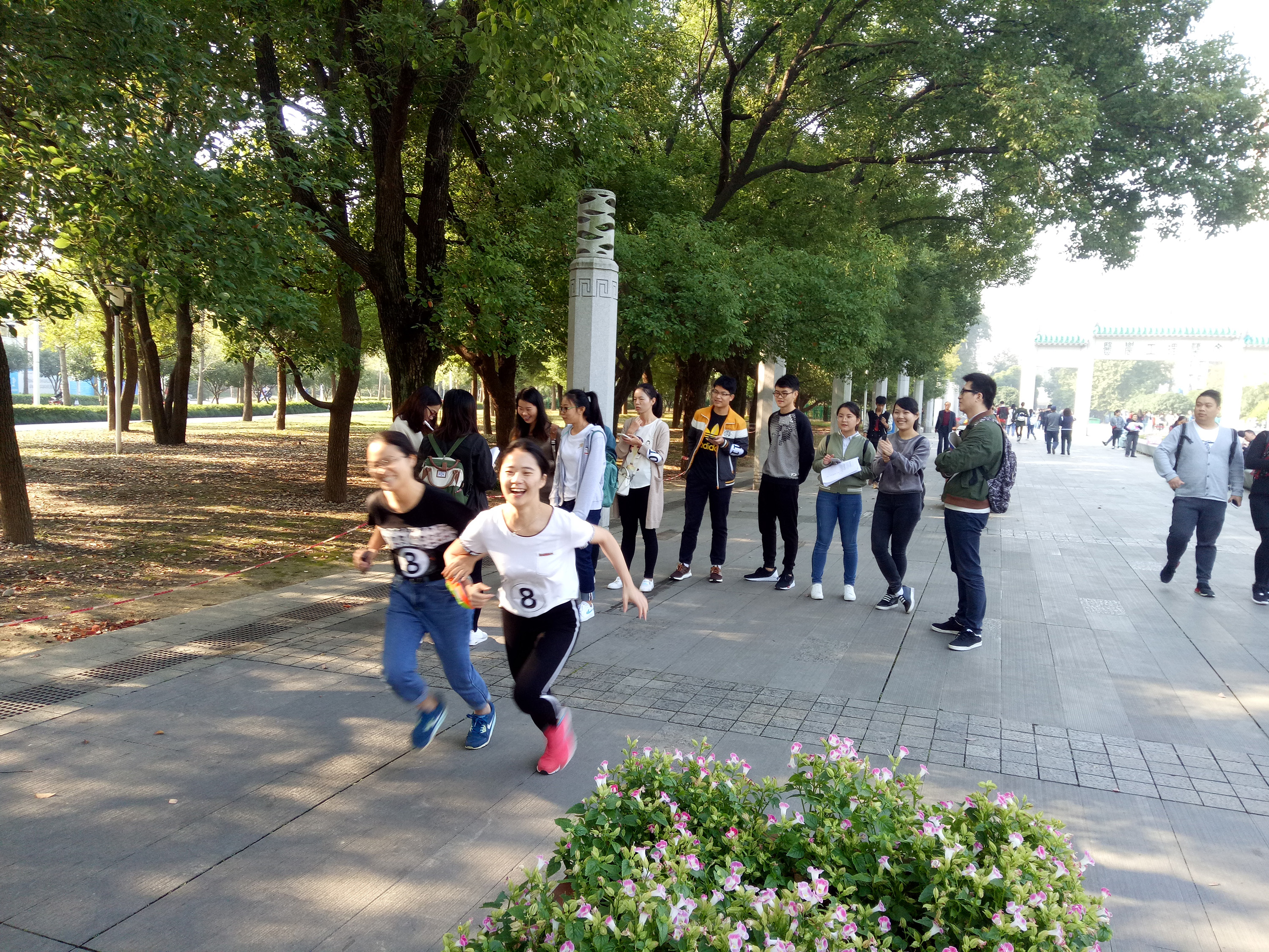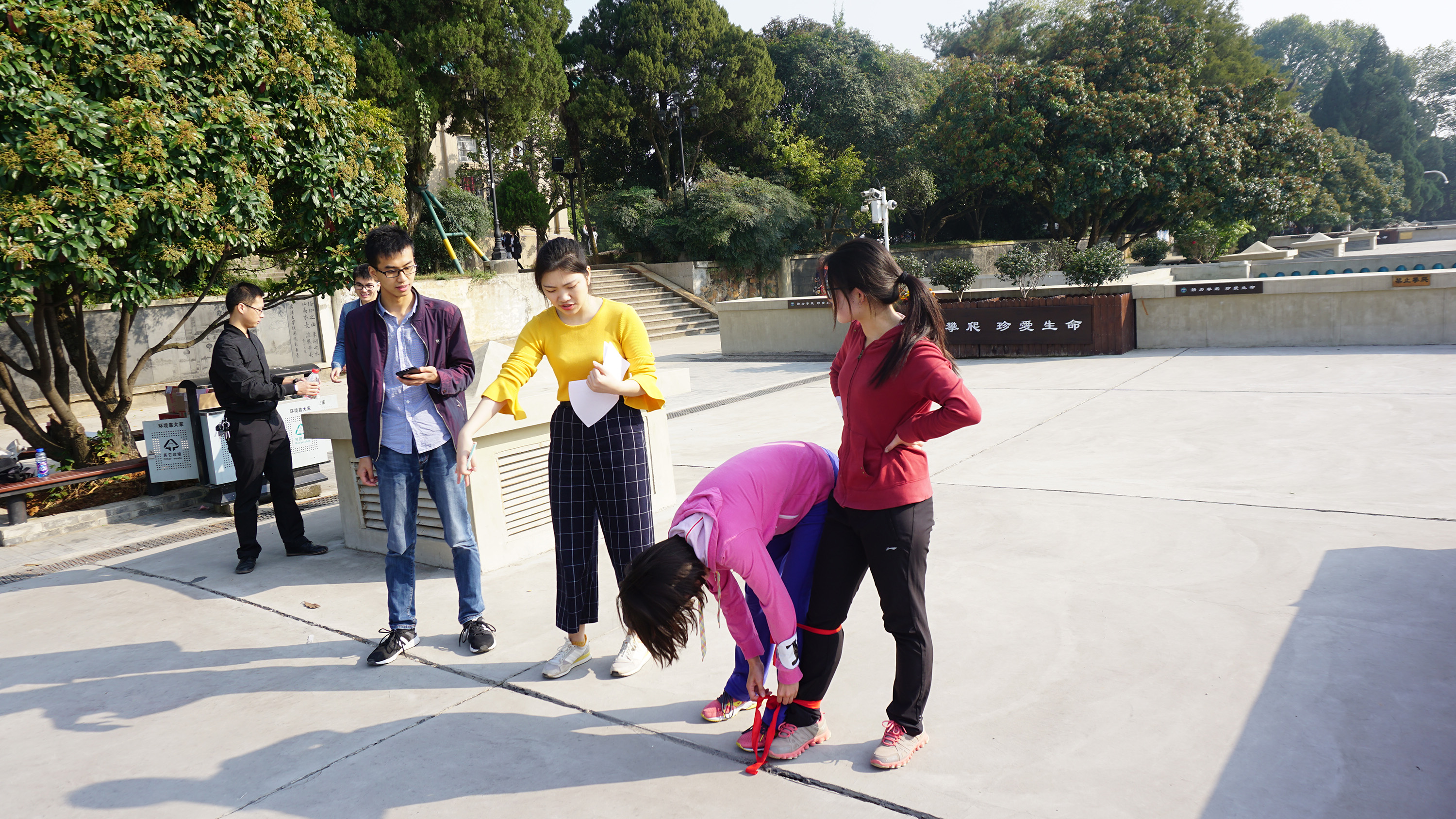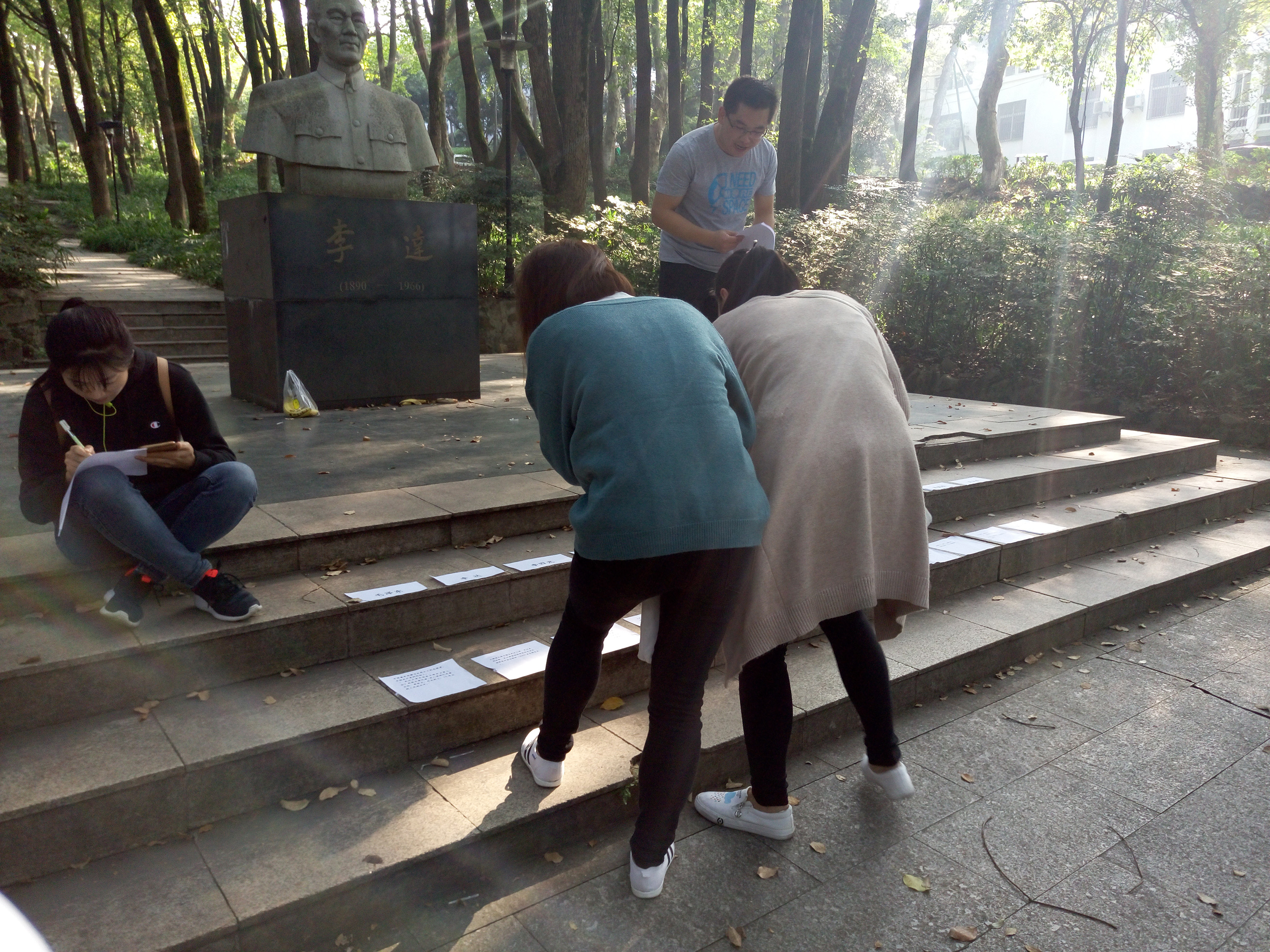 此次活动分为五个关卡:(1)正门牌坊:连线十九大——说出关键词;(2)“六一亭”:一触即发——党建知识简答;(3)李达雕像:追根溯源——武大的红色历史人物知多少“连连看”;(4)九一二操场:疯狂来往一起跳——你说我猜+跳绳;(5)老图樱顶:齐力冲顶——两人三脚+校史问答。活动于上午9时准时打响,工作人员按照策划书内容进行赛前培训与合理分工,提前一个小时到场进行场地布置,与此同时,参赛人员两两组队,不分年级与性别,则按照指定路线与内容展开活动。活动伊始,参赛队伍提前10-15min到达正门牌坊抽签决定出赛顺序,然后贴上相应的号码牌,等待开始答题指令。