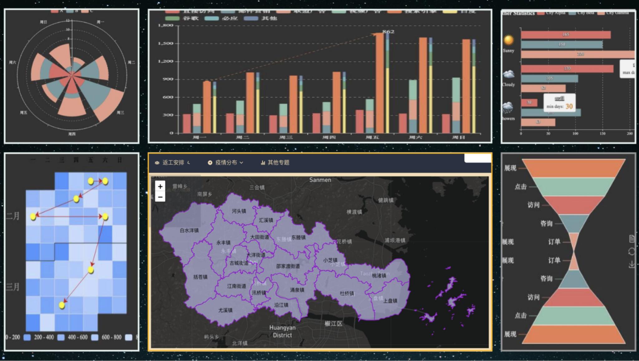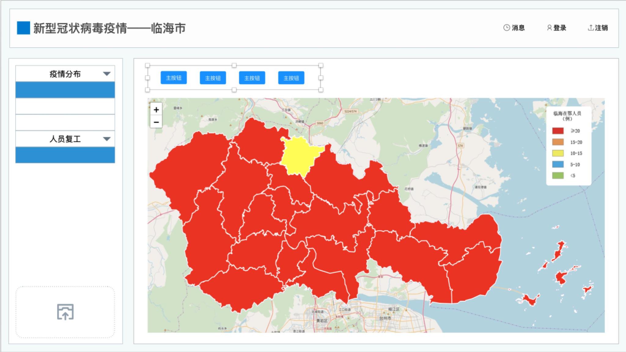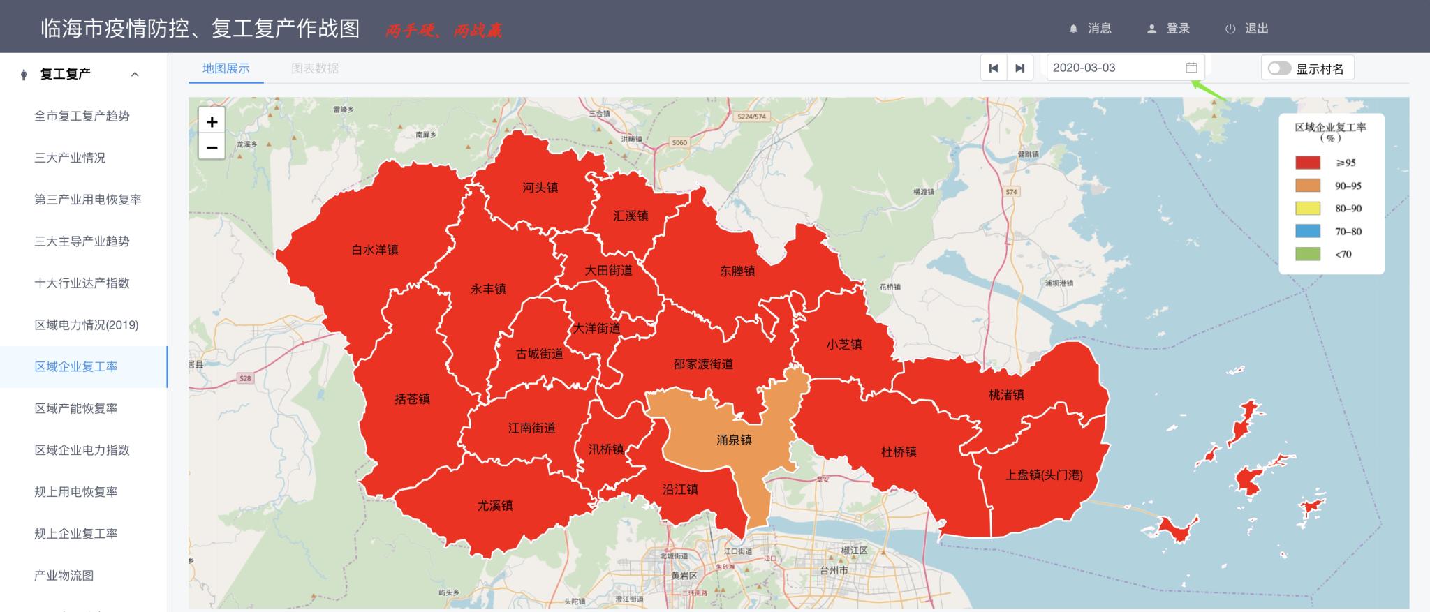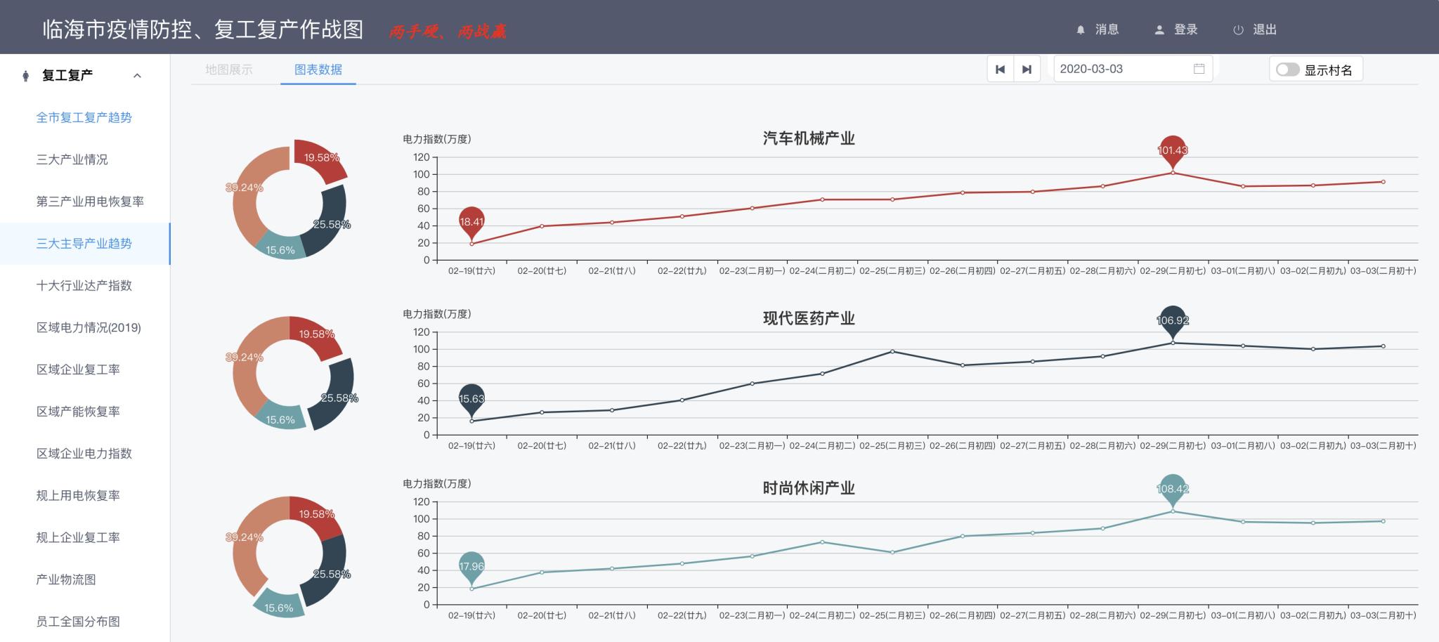 疫情就是命令,复工复产就是责任。随着疫情发展趋势逐渐好转,浙江省将复工复产工作放到了首位,随后提出了以复工复产为主,但绝不可松懈疫情监控的要求。新要求产生了新需求:将历史数据保留并随时查看,在此基础上进行实时更新。开发小组立刻进行了第二轮讨论和优化,将电子地图重心从疫情防控图转移到复工复产图,研发了地图为主,图表为辅的全方位、全周期、全数据的展示功能。在抗疫地图的支持下,临海市委市政府信息中心能够将疫情数据,复工复产数据进行实时更新、动态展示,历史查询等,让政府决策者一目了然。