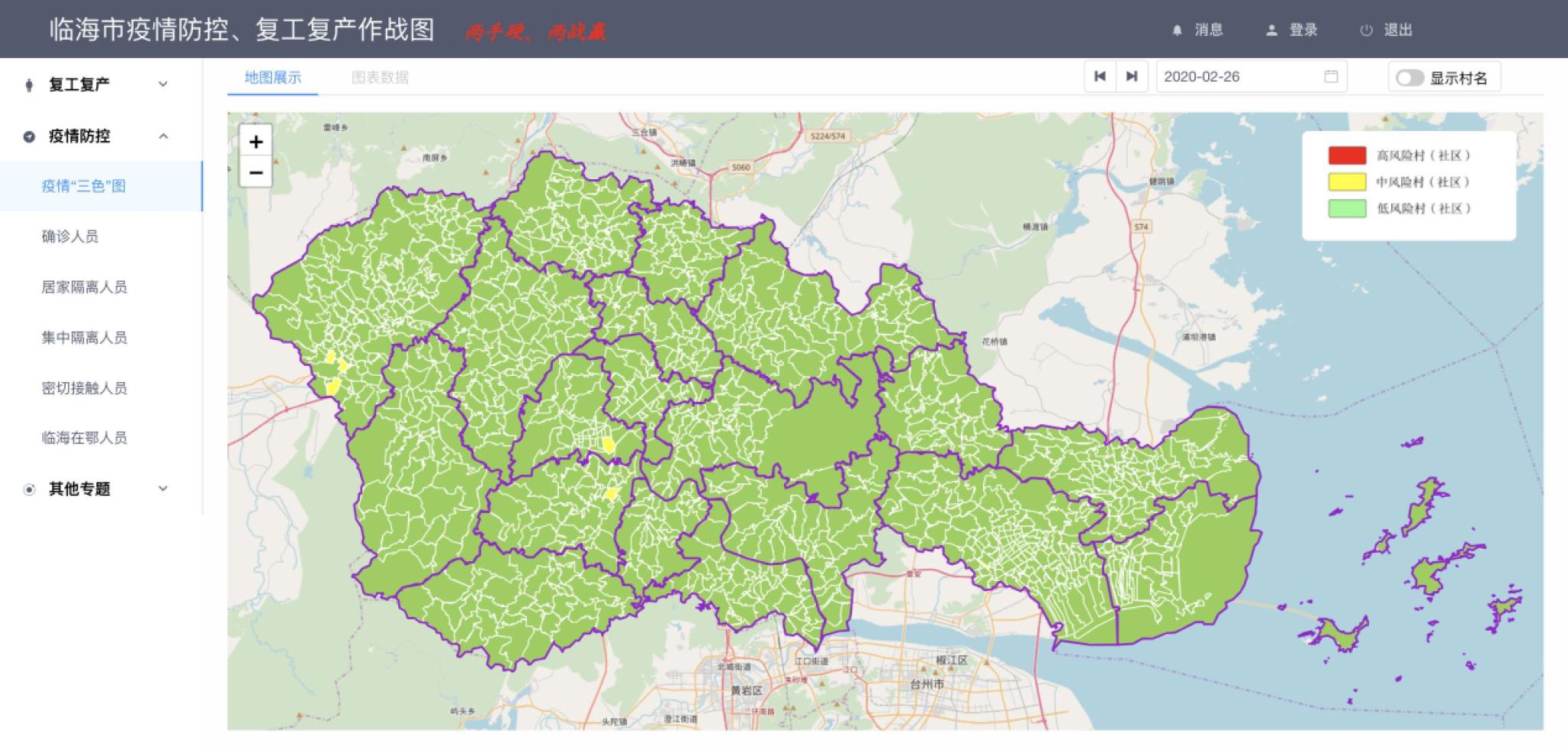 尽管有技术储备,但本次临海市抗疫地图开发面临:制图数据众多、地图类型较杂、更新频率很高等困难,在两天内完成具有很大挑战。开发小组丝毫不惧,经过一晚的在线讨论和协作,终于搭建起来了系统基本框架,生成和发布了第一张专题地图,后经集体讨论和快速优化后,系统部署到阿里云上,正式提供临海市疫情防控、复工复产作战图等服务,这一成果也证明了团队的在线专题地图技术在关键时刻能“用的上、扛得住”。