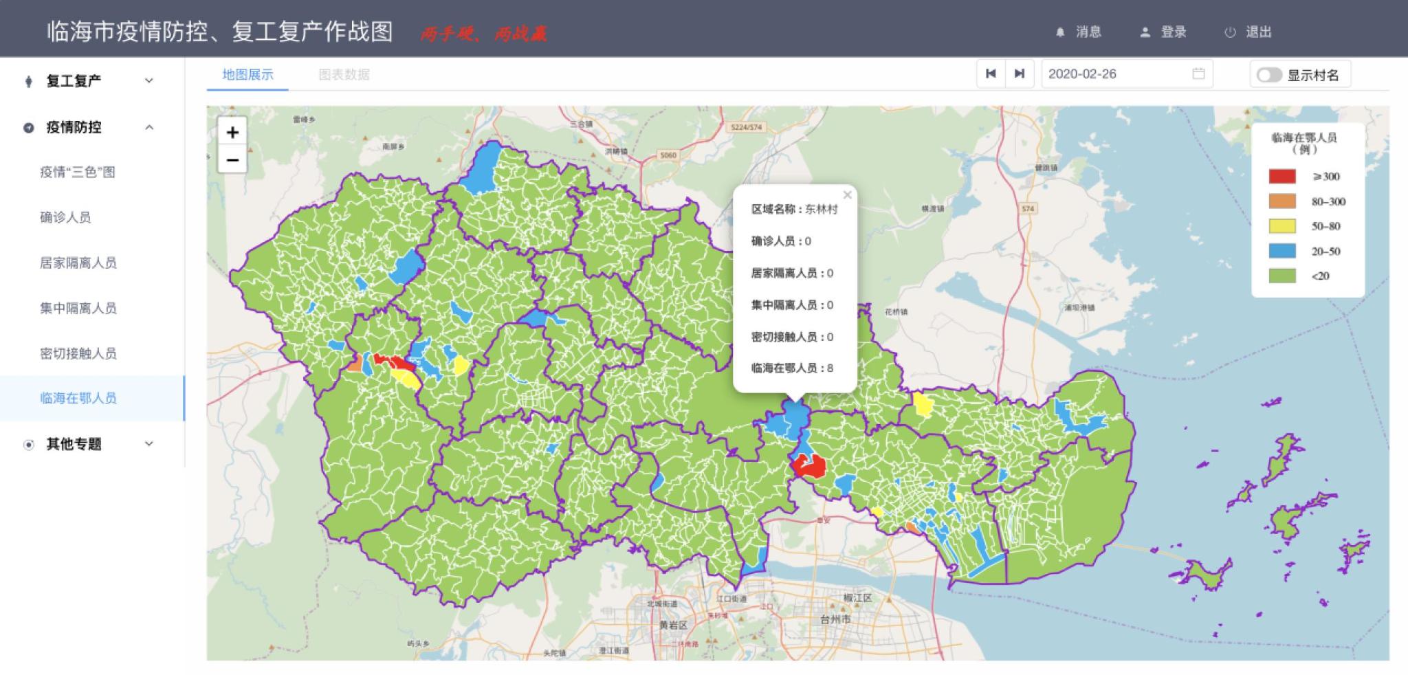 与网上许多在线地图不同,临海市抗疫地图将农村疫情作为重点表达对象,其中疫情防控、复工复产作战图的制图对象十分精细,符号表达要遵从浙江省疫情五色制图规范,疫情信息从乡镇到行政村有上百个行政单位需要全部“落地”到位,并详细展示数据细节,这才能充分体现了政府疫情的防控短板在农村,加强农村疫情防控的工作要求。该系统是目前最早做到村镇级别的疫情地图之一。