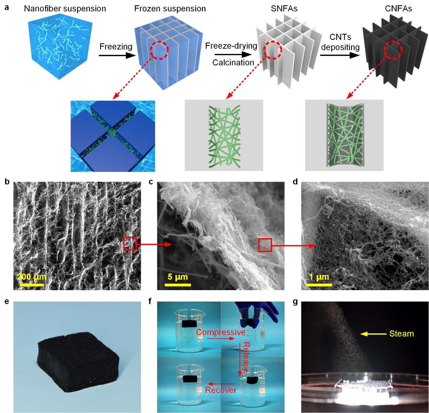 图2 a) CNFAs的制备和结构示意图。b–d)CNFAs在不同放大倍数下的微观多孔结构。e)具有高吸光度的CNFAs。f)CNFAs在水中的压缩和回弹。g)从CNFAs表面产生的蒸气。
