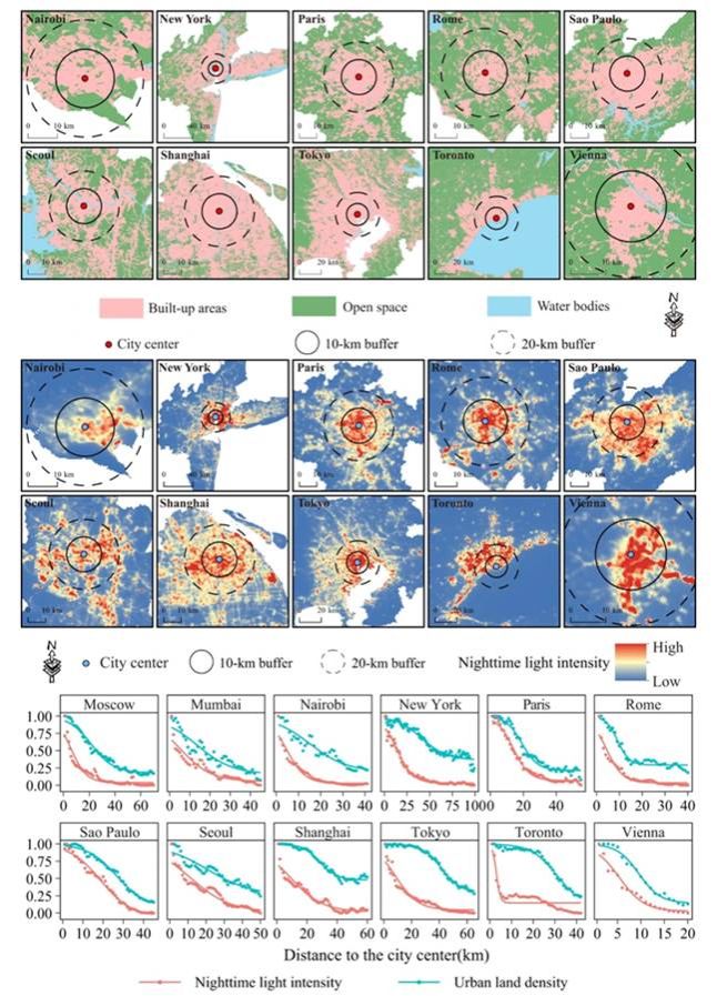 城市人口等社会经济要素的空间集聚是城市的本质特征。如何定量刻画城市要素空间集聚模式是地理学、经济学、城市规划等领域共同关心的科学问题。该论文以全球30个典型特大城市为例,选取遥感获取的2020年城市建设用地和夜间灯光,分别表征城市物理空间和社会空间。从城市中心向外建立多层缓冲区,据此分区统计得到建设用地密度和夜间灯光强度的梯度分布。