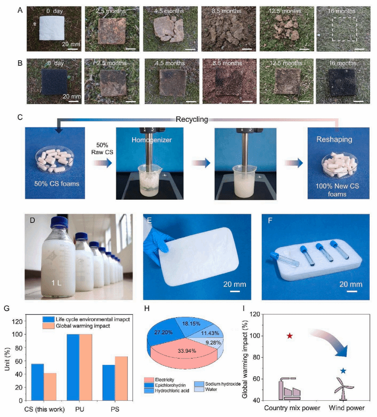在后续的开发中,课题组联合施晓文教授团队通过冷冻-解冻的方法,使上述中两种不同尺度的纤维可以受到冰晶生长的驱动自组装形成交错微纤维和纳米纤维的互连三维网络结构,无需冷冻干燥即可形成力学性能良好的壳聚糖气凝胶(CMNF),并系统评估了其在可降解生物塑料方面的应用潜力及环境影响。相关成果以“Scalable fabrication of biodegradable, thermally insulating, fire-proof bioplastic foams via rapid magnetic force assisted squeezing and ambient drying”为题发表于期刊《Chemical Engineering Journal》上,课题组2022级博士生齐鲁荷为第一作者,陈朝吉教授、施晓文教授为共同通讯作者。
