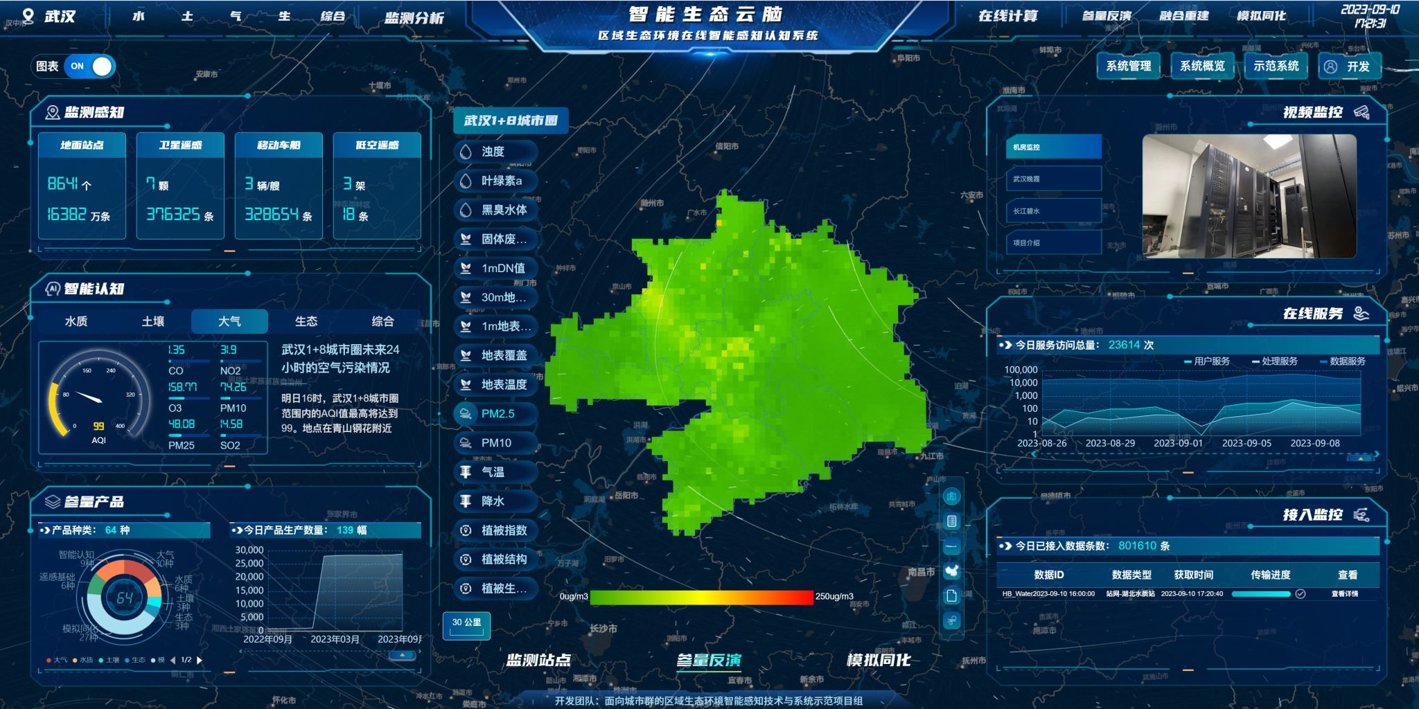 基于平台生产了30余种城市群“水-土-气-生”环境数据产品,空间范围包括武汉1+8城市圈、长江中游城市群、长江经济带、全国、全球等不同尺度,在覆盖度、时空分辨率、时空连续性等方面具有独特优势。项目支撑了生态环境部长江流域管理局、湖北环保厅等8家单位的监测业务,包含大气污染热点网格监测、长江干流水质巡测、气象水文一张图等7个典型应用示范场景,突破了常规业务监测时空不连续的瓶颈,大幅提升了业务效率。