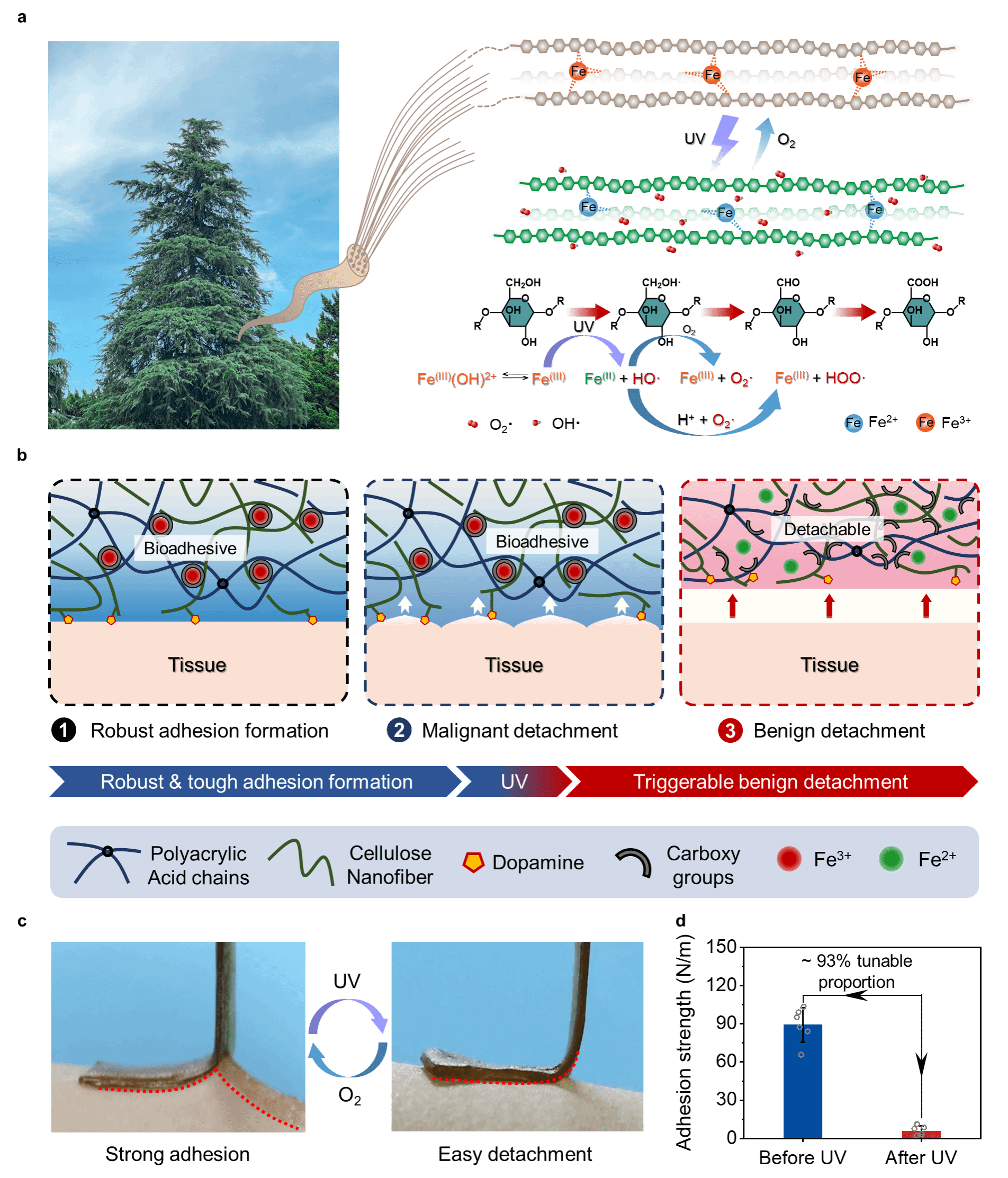 陈朝吉教授团队联合中国林科院林化所刘鹤研究员团队创新性地提出一种纳米纤维素介导超分子网络多重动态协同调控策略,成功构建了一类具有强韧、可逆粘附和光触发分离的超分子水凝胶(图1)。来源于林木生物质细胞壁的纳米纤维素(CNF)被引入到水凝胶超分子网络,其对超分子网络的增强作用结合Fe3+与聚合物链之间的强配位相互作用以及多巴胺(DA)粘合基团共同赋予水凝胶优异的机械性能和粘附性能。当水凝胶暴露在紫外(UV)光下时,Fe3+与CNF网络发生类光芬顿(P.F.)反应,Fe3+被还原为Fe2+(CNF作为绿色类芬顿试剂),水凝胶络合网络发生解离与重构,从而使水凝胶表现出快速、高效的按需光脱附的粘合行为。令人惊喜的是,该纳米纤维素介导超分子网络多重动态协同调控策略对不同的天然及合成高分子具有广泛的普适性,为具有优异粘附-脱粘性质的动态超分子凝胶的设计提供了新思路。