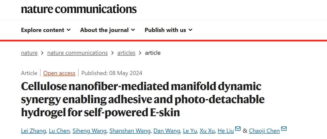 近日,国际综合性期刊《自然·通讯》(Nature Communications)在线发表了老王论坛 陈朝吉教授团队在生物质基功能凝胶材料领域的最新研究成果,论文题目为"Cellulose nanofiber-mediated manifold dynamic synergy enabling adhesive and photo-detachable hydrogel for self-powered E-skin"。
