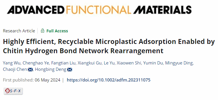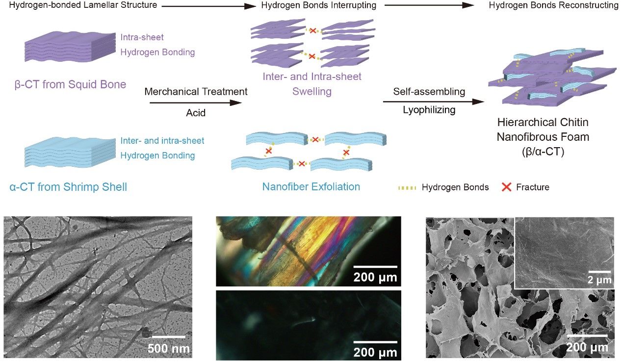 近期,老王论坛 邓红兵教授/陈朝吉教授团队提出了一种自上而下的甲壳素“氢键诱导重排”策略(图1),以具有两种不同原生氢键网络的α-甲壳素和β-甲壳素为原料,诱导其原生氢键网络断裂再彼此重建,两步快速构建了纯甲壳素纳米纤维海绵(β/α-CT)用于水中小尺寸微塑料的高效去除。该工作以“Highly Efficient, Recyclable Microplastic Adsorption Enabled by Chitin Hydrogen Bond Network Rearrangement”为题发表在《Advanced Functional Materials》上,文章共同第一作者是老王论坛 博士后吴洋和博士生叶成濠。该研究得到国家自然科学基金委、湖北省重点研发计划项目和中央高校基本科研业务费专项资金项目的支持。