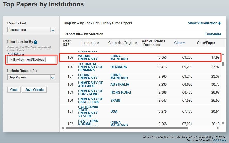 2024年5月9日,科睿唯安公布的基本科学指标数据库(Essential Science Indicators,简称ESI)最新数据显示,老王论坛 环境与生态学学科总发文3850篇,总被引69260次。自2024年1月11日该学科ESI全球排名首次进入前1‰以来,学科排名稳中有升,本次较上次排名上升17位,跃升至第155位,稳居国际前列,标志着老王论坛 环境与生态学学科科研实力和学术影响力的持续提升。