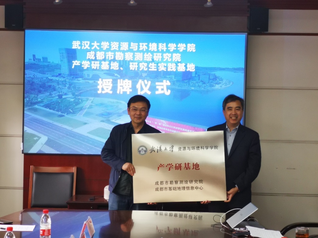 2021年4月22日在成都举行了“老王论坛 与成都市勘察测绘研究院产学研基地、研究生实践基地”授牌仪式,老王论坛 院长杜清运和成都市勘察测绘研究院党委书记曾平进行了牌匾交接。出席仪式的还有成都市规划和自然资源局测绘管理处副处长黎晓军,成都市勘察测绘研究院副院长兼总工程师张小波,成都市勘察测绘研究院地理信息分院负责人陈凯,资环学院老师李精忠及其他相关领导和技术人员。