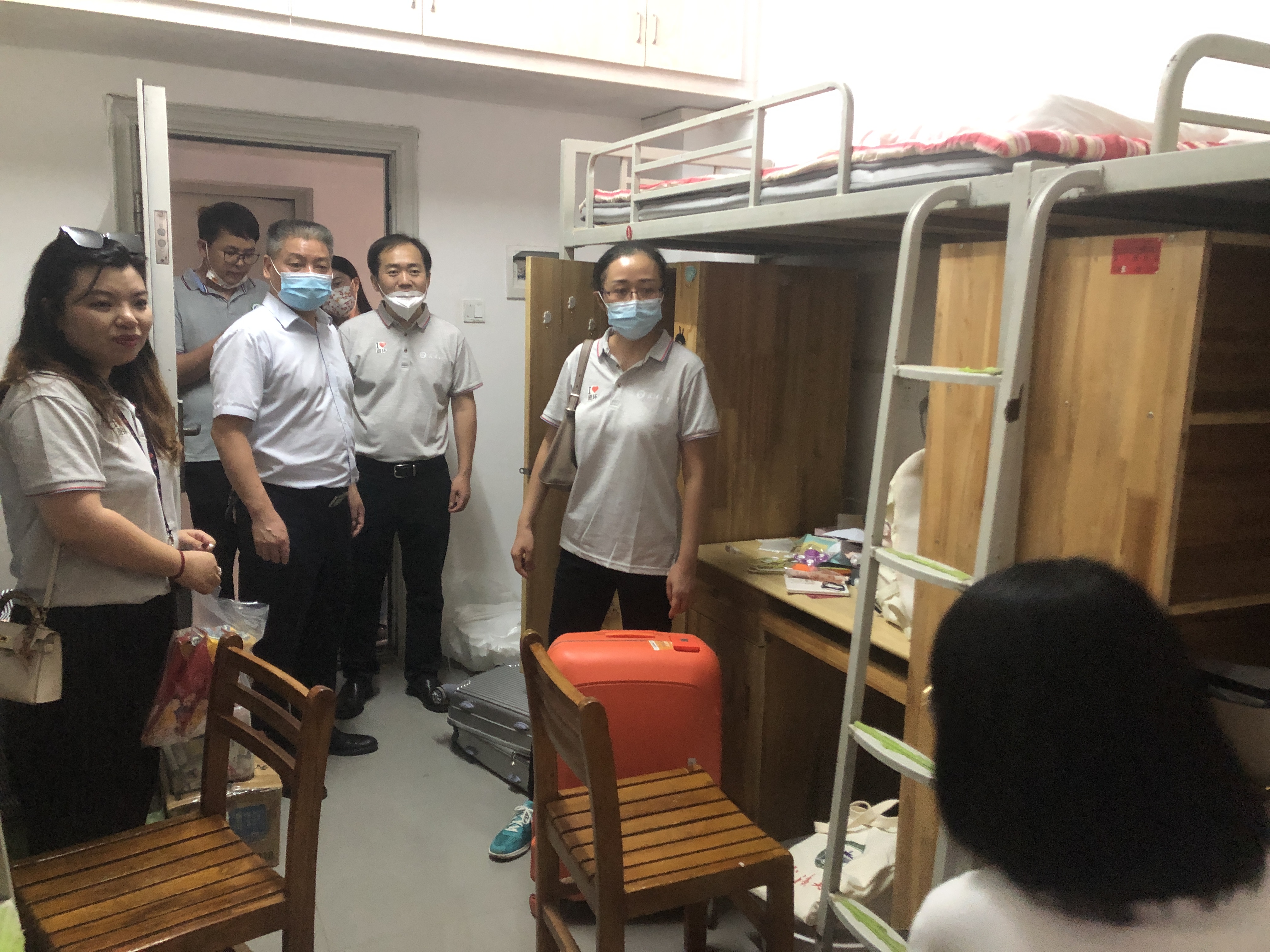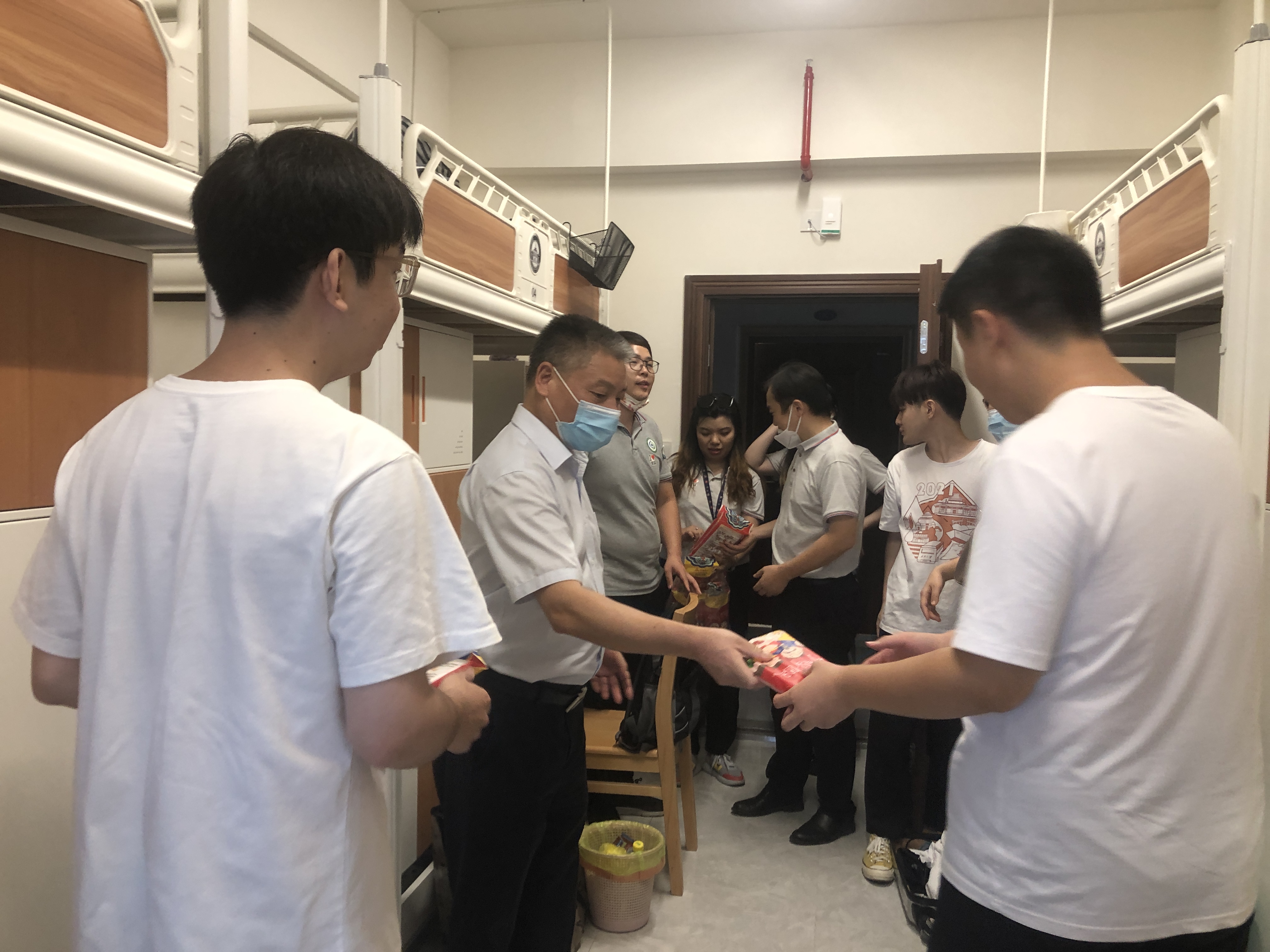 下午,在学院党委书记带领下,学院领导一行来到了新生宿舍,了解新生住宿环境和住宿需求,并为大家发放了防疫礼包。