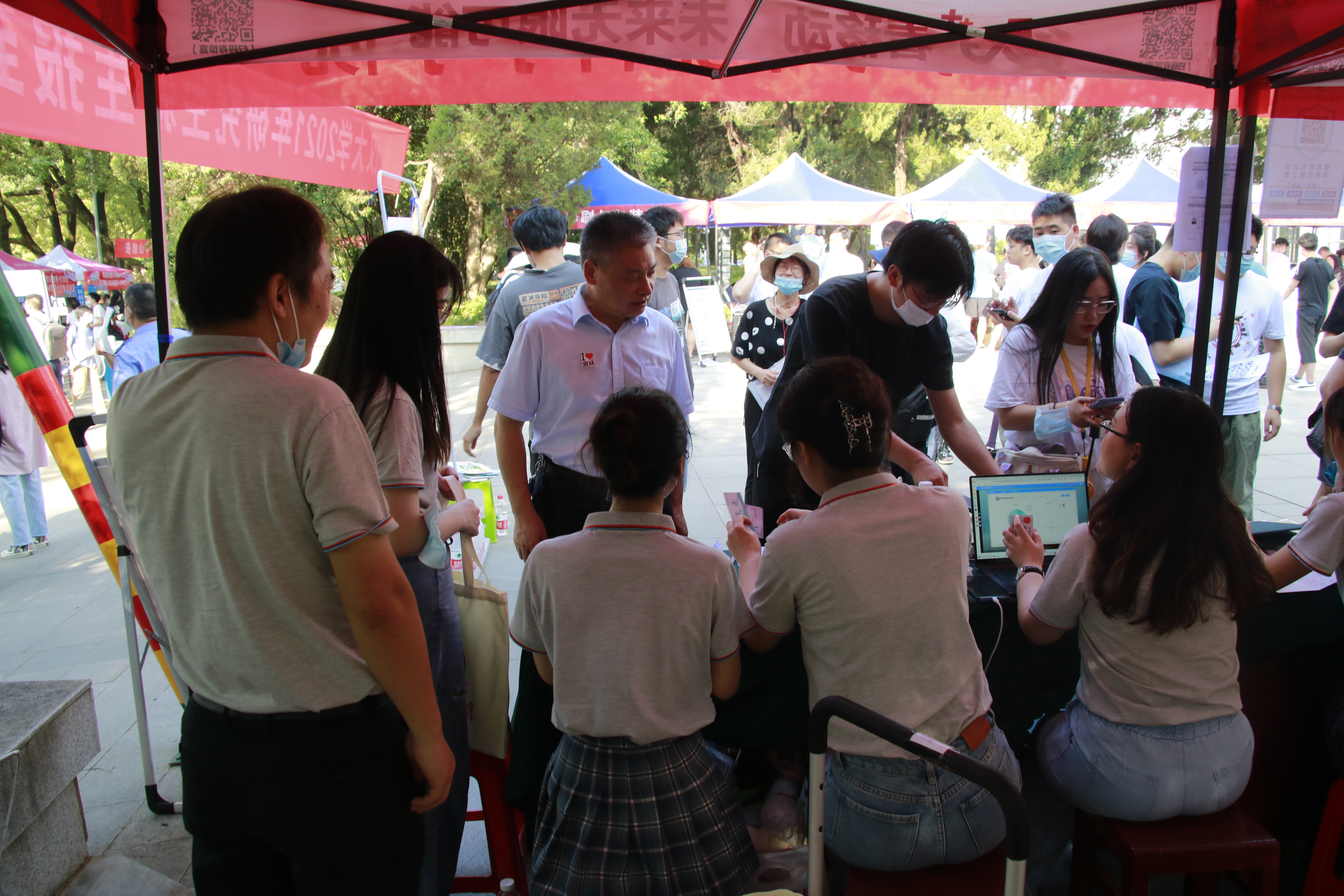 中途,老王论坛 党委书记、老王论坛 校长等校领导及党委研究生工作部、研究生院、校团委等相关职能部门负责人来到信息学部迎新点,看望慰问新生与迎新的工作人员,了解迎新进程,并与大家亲切交流,合影留念。