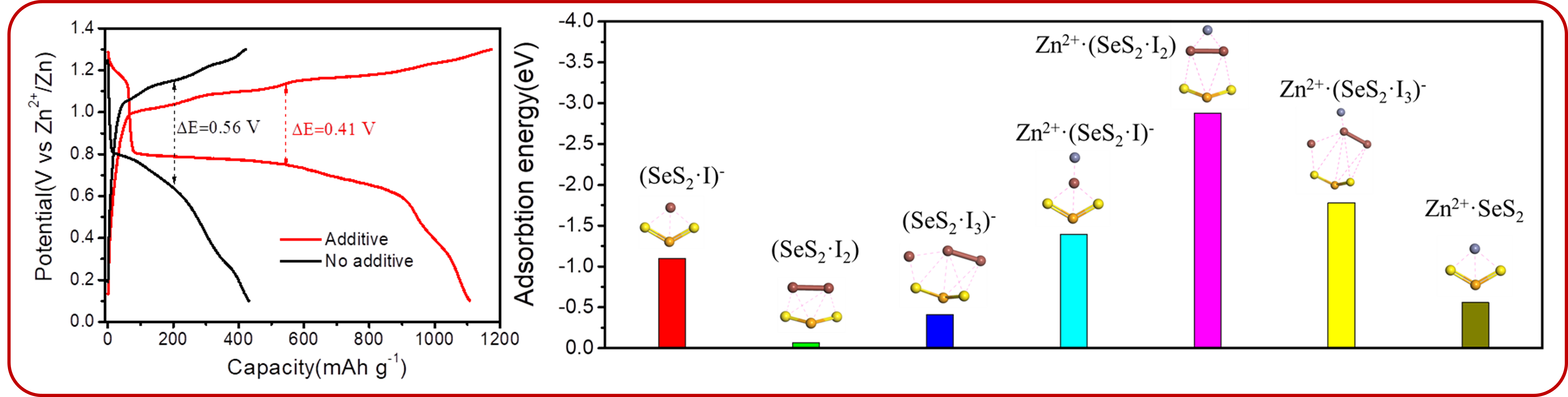 为了克服上述问题,设计以SeS2取代S,同时采用磷掺杂碳纳米片(PCS)对其包覆 (SeS2@PCS),并且优化电解液成分的策略。研究发现,在电解液中添加0.1wt%碘充当氧化还原的媒介,不仅显著改善电极与电解液的兼容性,而且能提高材料的利用率和降低反应极化。同时,该添加剂还有利于Zn2+离子在SeS2表面吸附,提高反应动力学。基于此,SeS2@PCS电极可以放出高达1107 mAh g−1的可逆容量和 0.74 V的平坦放电平台,对应能量密度高达772 Wh kg-1,该数值高于目前报道的大多数正极材料,而且极化也显著降低到0.41 V (Chem. Eng. J. 2021, 420, 129920) 。