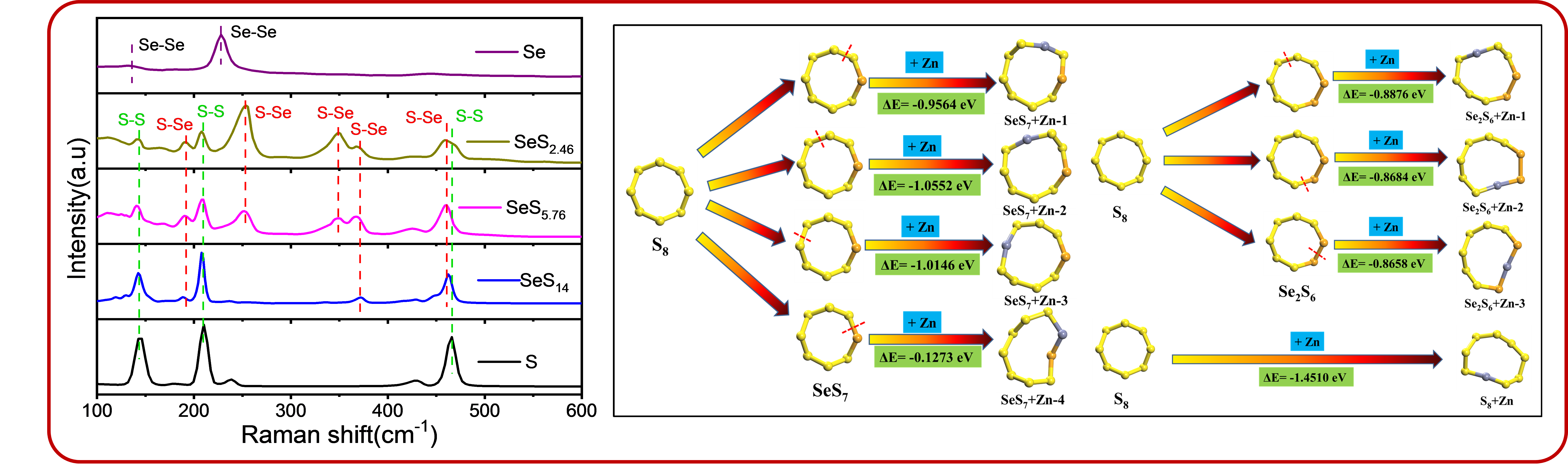 为了进一步揭示S与Se之间的相互作用,设计了三类富硫的硫硒固溶体 (SeS14 , SeS5.76和SeS2.46)。研究发现,硒的引入了,不仅可以提高固溶体的电子电导率,而且由于硫与硒之间存在较强的耦合作用,使得硫硒固溶体的平均放电电位均高于纯硫和纯硒。通过理论计算发现,Se可以调节S的电子密度,能带结构和反应电化学活性,从而促进与Zn的电化学反应。通过进一步优化硒含量,发现SeS5.76的性能相对最优,具有较好的倍率性能和循环性能,而且能量密度高达867.6 Wh kg-1 (Adv. Funct. Mater. 2021, 2101237) 。