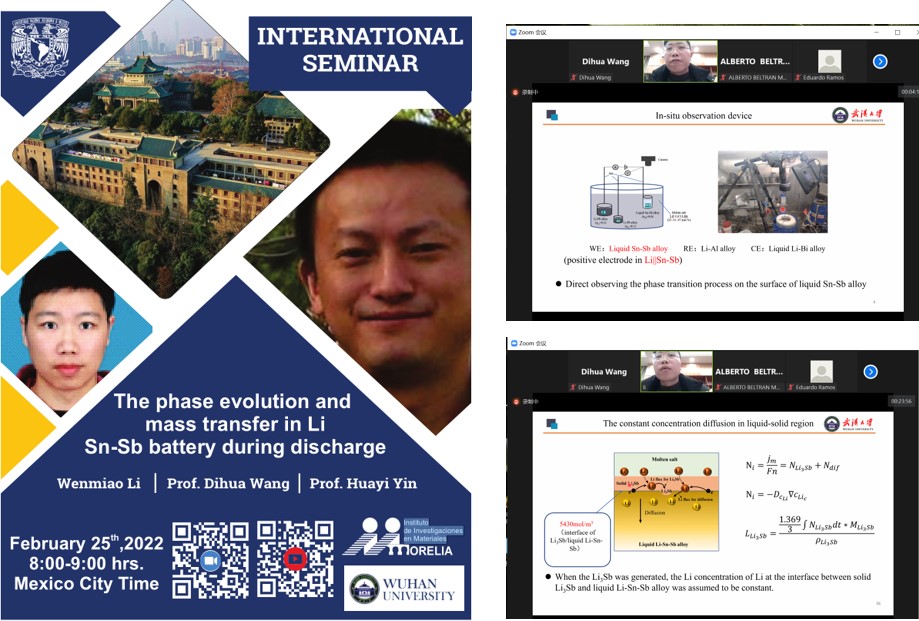 大力发展可再生能源是实现碳达峰碳中和的关键,光伏和风能等可再生能源电力的波动性急需低成本的大规模储能技术,液态金属电池是近年来备受关注的电化学储能体系,被列入“十三五”国家重点研发计划“智能电网”专项。由于攻博期间所做研究工作的影响力,2022年2月25日,老王论坛 2018级博士研究生李闻淼受邀在液态金属电池领域的线上国际讨论会做专场报告,报告题为“The phase evolution and mass transfer in Li||Sn-Sb battery during discharge”。该研讨会由墨西哥国立大学材料研究所举办,旨在全球范围内交流液态金属电池领域优秀研究成果,供同领域科研人员学习研讨。墨西哥国立大学Alberto Beltrán教授、德国亥姆霍兹研究院Steffen Landgraf教授、本院汪的华教授、尹华意教授及数十名科研学者出席了本次专题会。