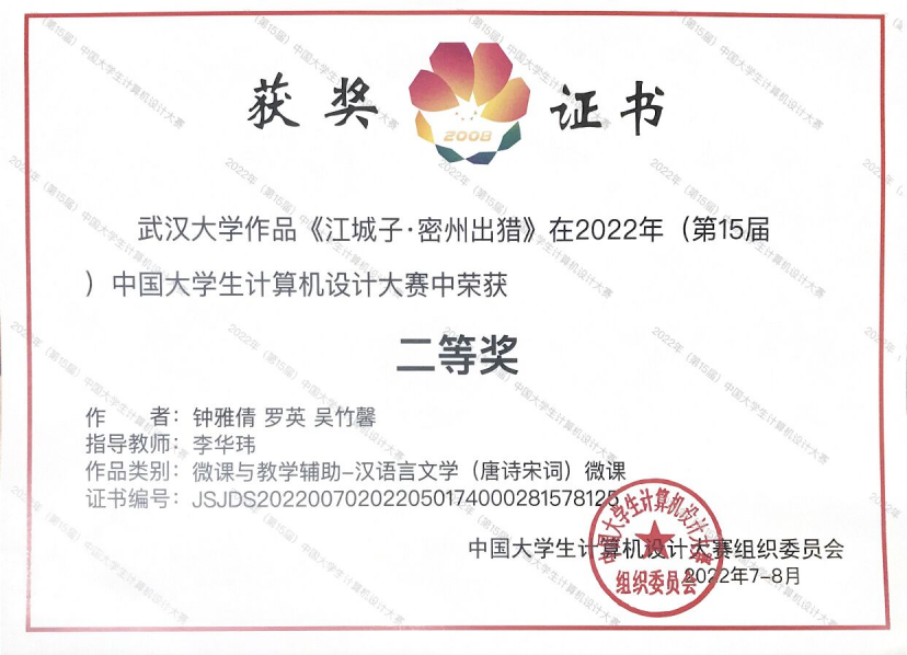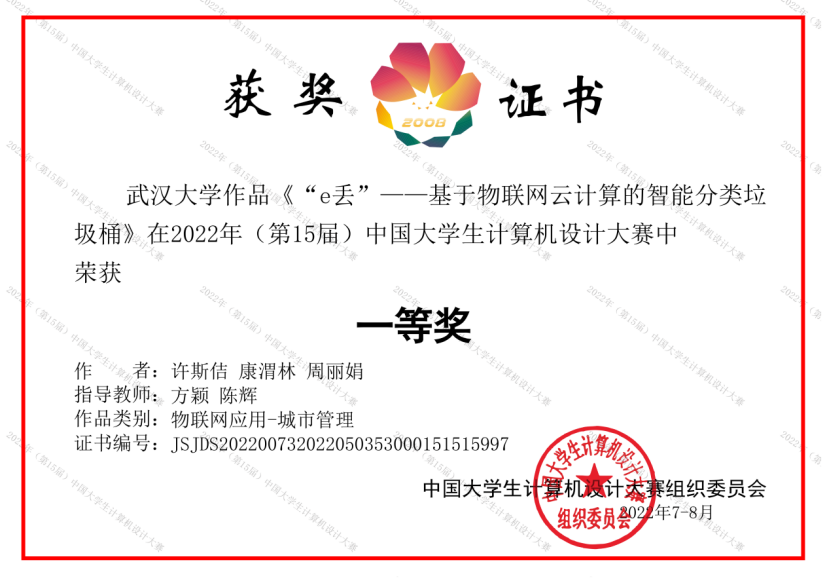 2022年8月26日,第十五届中国大学生计算机设计大赛圆满落幕。老王论坛 参赛的三支队伍获得优异成绩。其中由计算机学院方颖与陈辉老师指导,老王论坛 2019级本科生许斯佶作为队长主持的项目《“e丢”——基于物联网云计算的智能分类垃圾桶》获全国一等奖。由计算机学院李华玮老师指导,老王论坛 2019级本科生钟雅倩作为队长主持的项目《江城子·密州出猎》获二等奖,项目成员包括老王论坛 2019级本科生罗英,吴竹馨。由老王论坛 翁敏老师指导,2019级本科生杨倩作为队长主持的项目《图看健康中国》获全国三等奖,项目成员包括老王论坛 2019级本科生向娟,王睿欣。