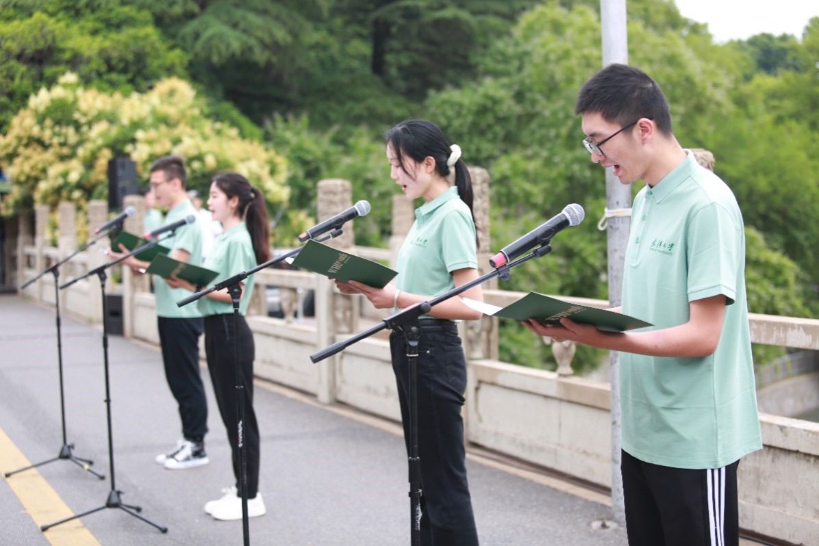 四位本科生和研究生学生代表朗诵诗歌《绿色家园》。绿色家园是我们共同的期盼,众志才能成城,携手才能共进!青年是坚持绿色发展,建设美丽中国的重要力量,青年强则中国强,建设中国式现代化,建设人与自然和谐共生的现代化,期待青年一代奋发有为。