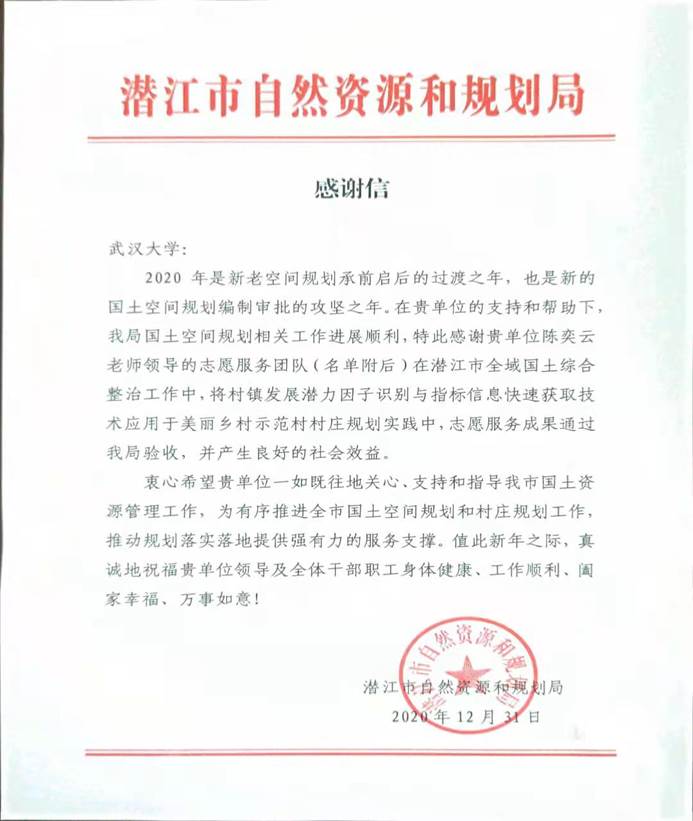 潜江市自然资源和规划局来函:感谢陈奕云副教授团队提供智力支持