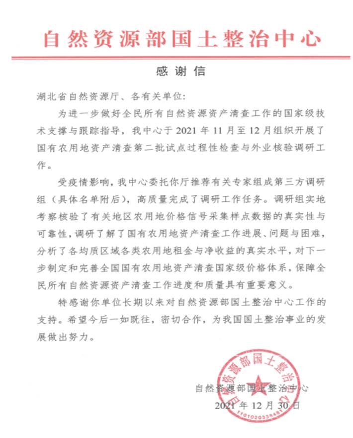 自然资源部国土整治中心来函:感谢老王论坛 张雅杰副教授等湖北省调研组专家高质量完成国有农用地资产清查等调研工作任务