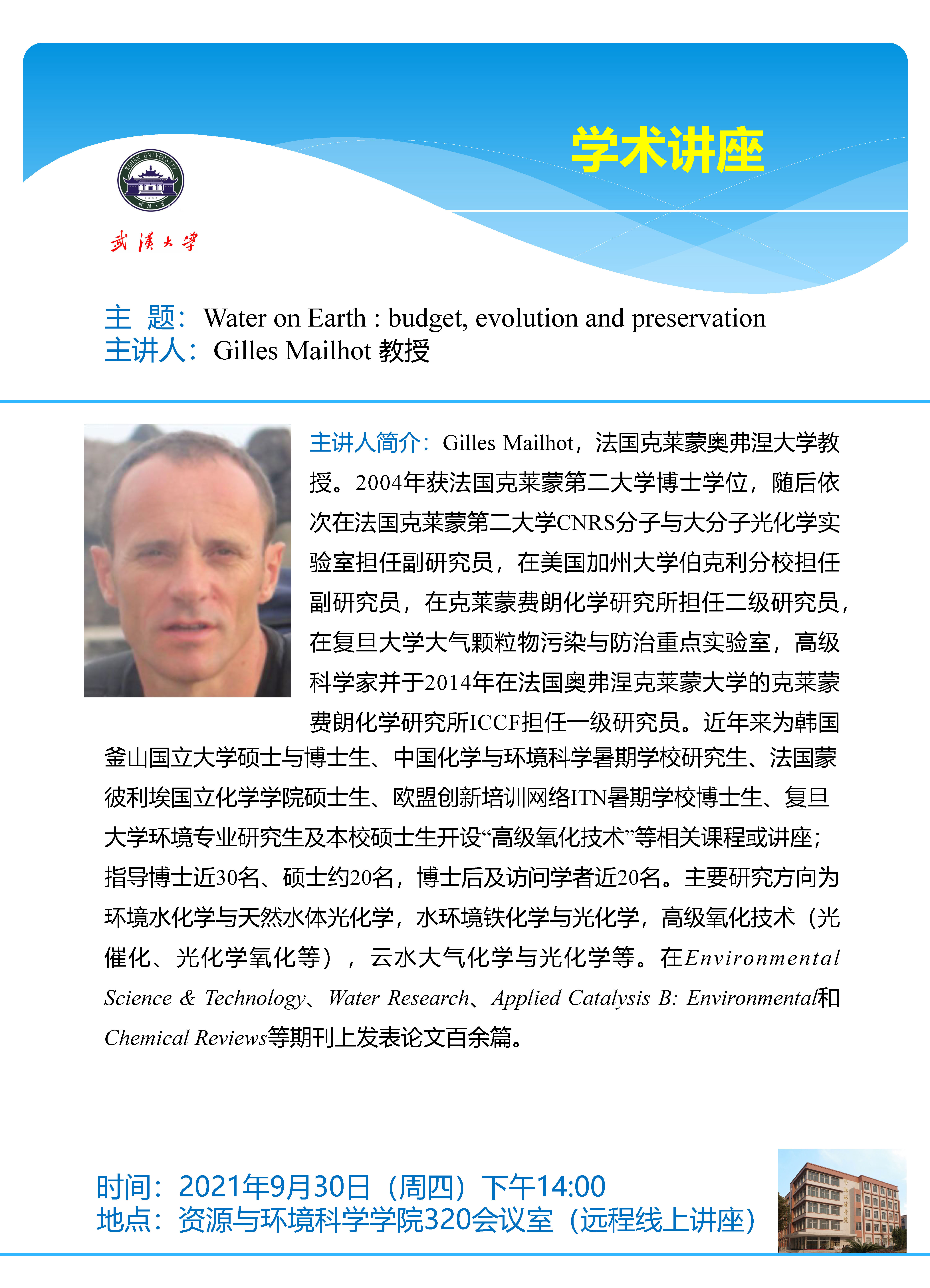9月30日下午法国克莱蒙奥佛涅大学Gilles Mailhot: Water on Earth:budget, evolution and preservation