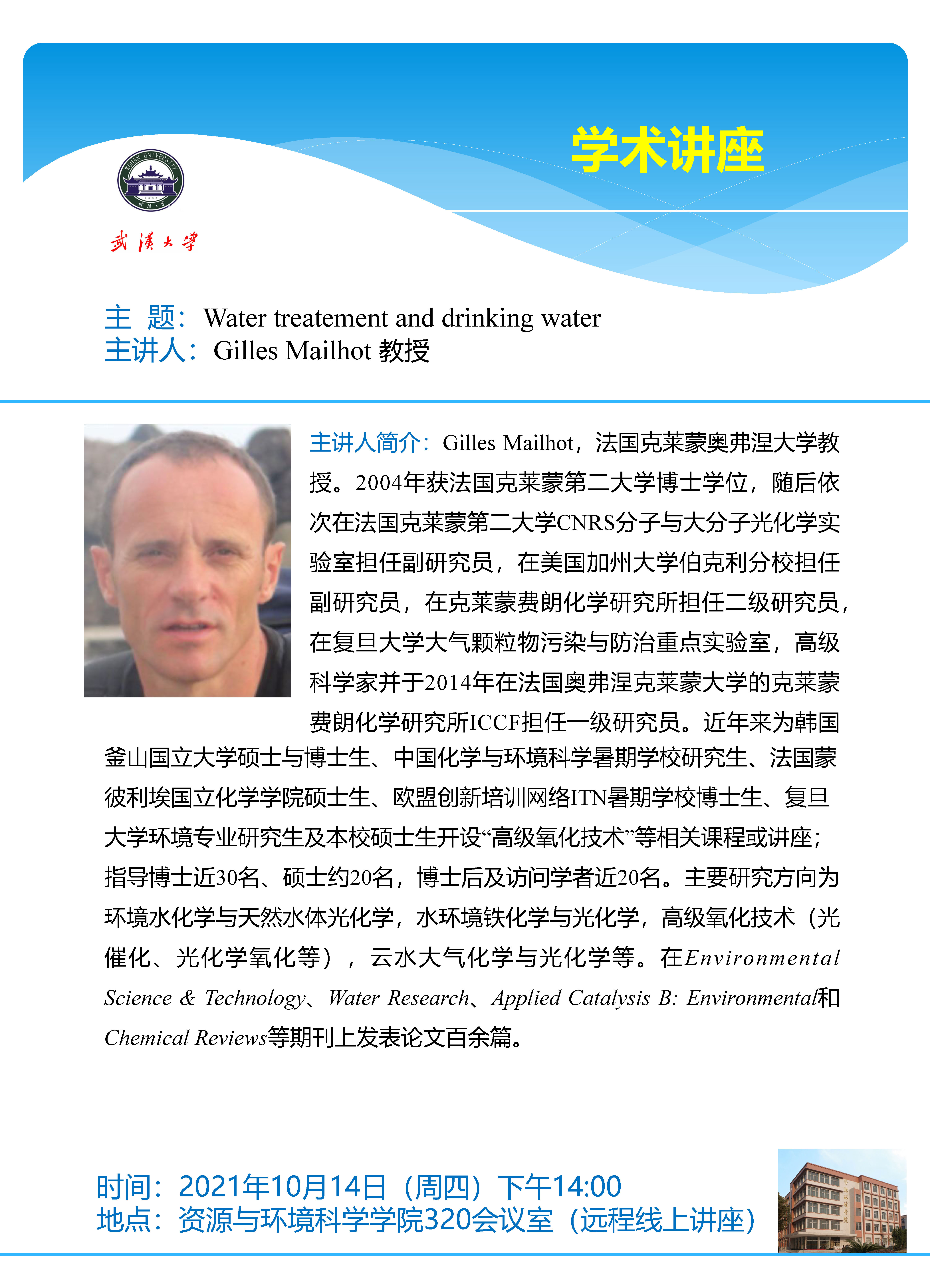 10月14日下午法国克莱蒙奥佛涅大学Gilles Mailhot:Water treatment and drinking water