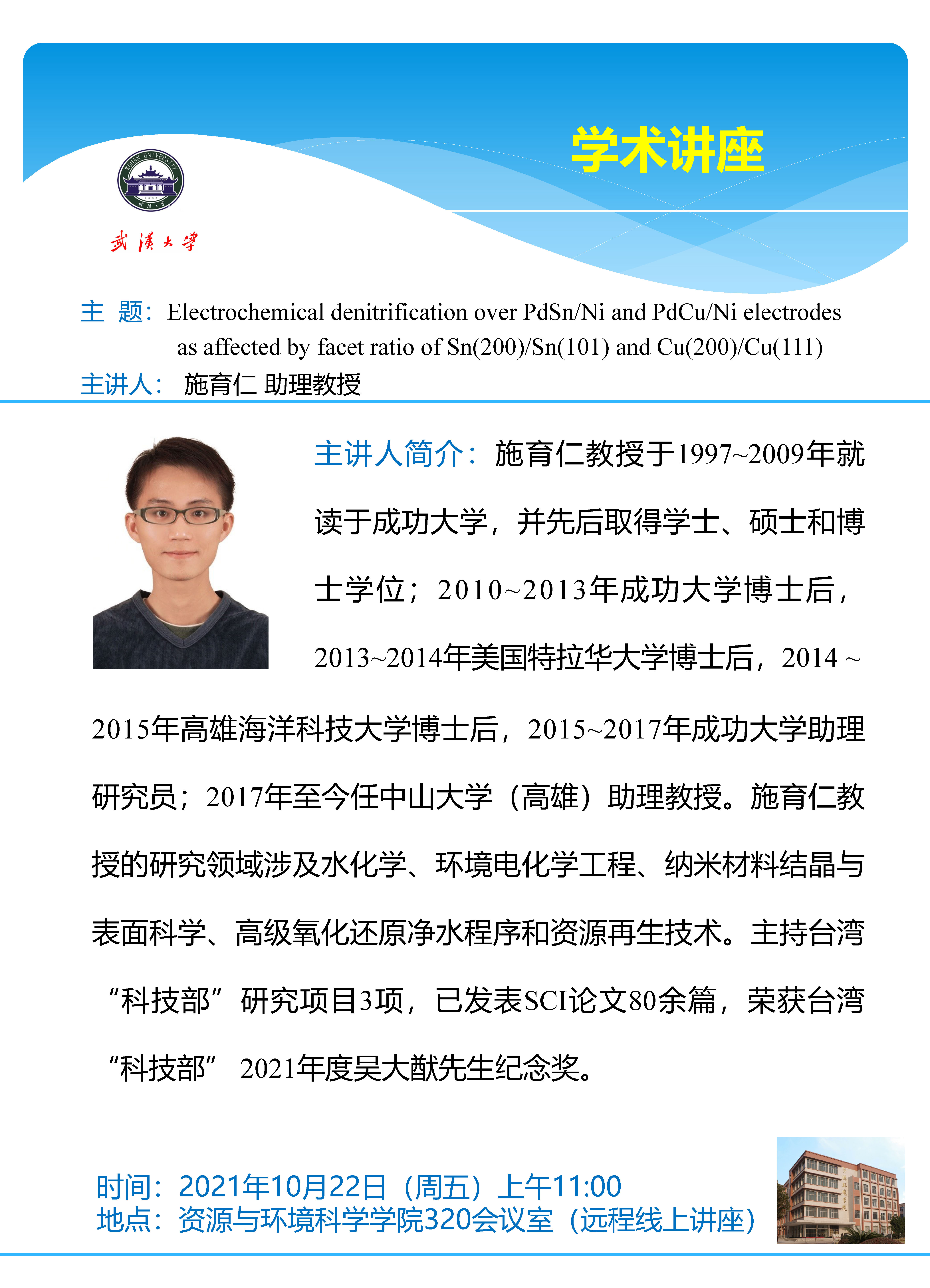 10月22日上午中山大学(高雄)施育仁教授:Electrochemical denitrification over PdSn/Ni and PdCu/Ni electrodes as affected by facet ratio of Sn(200)/Sn(101) and Cu(200)/Cu(111)
