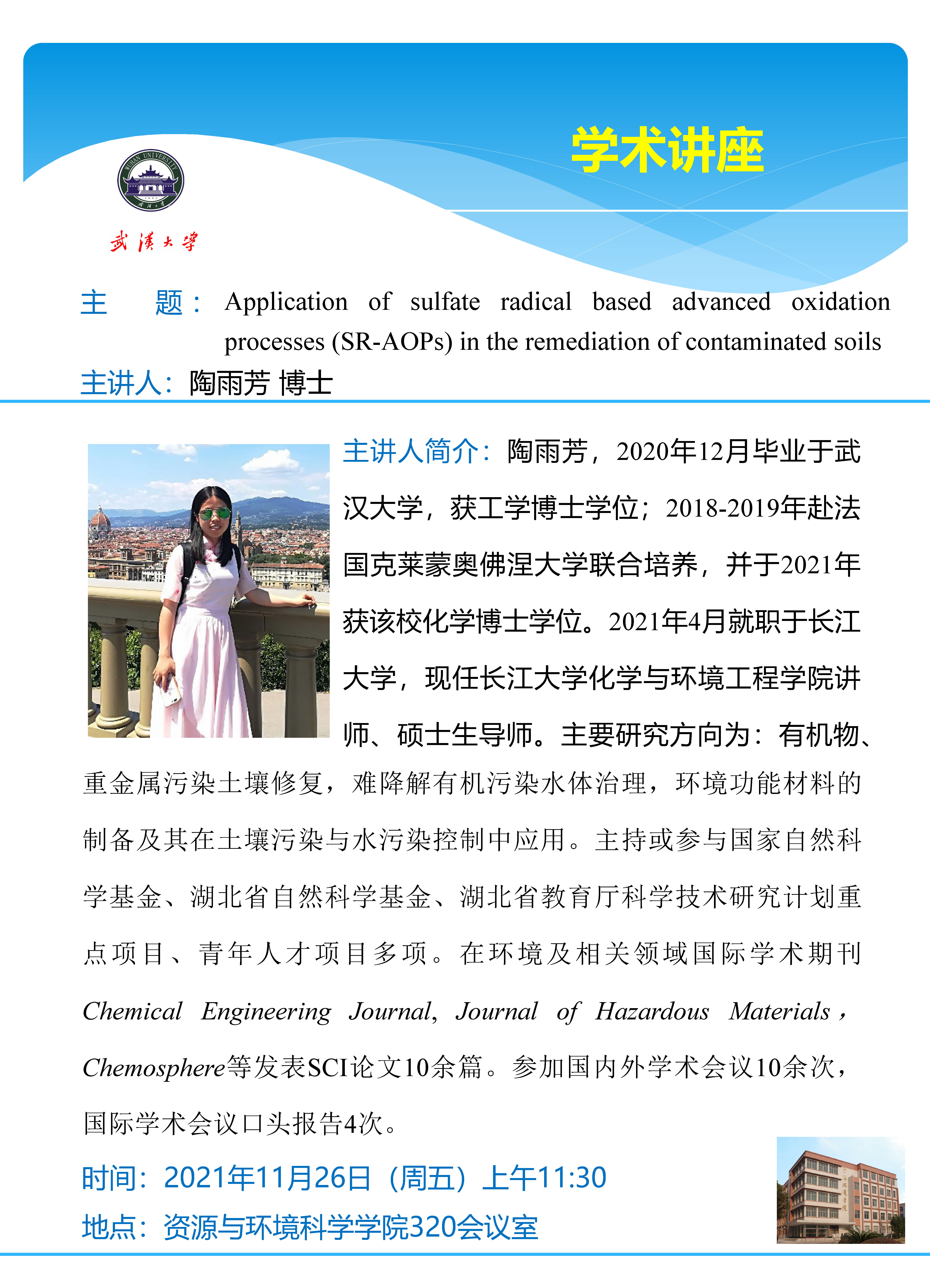 11月26日上午长江大学陶雨芳博士:Application of sulfate radical based advanced oxidation processes (SR-AOPs) in the remediation of contaminated soil