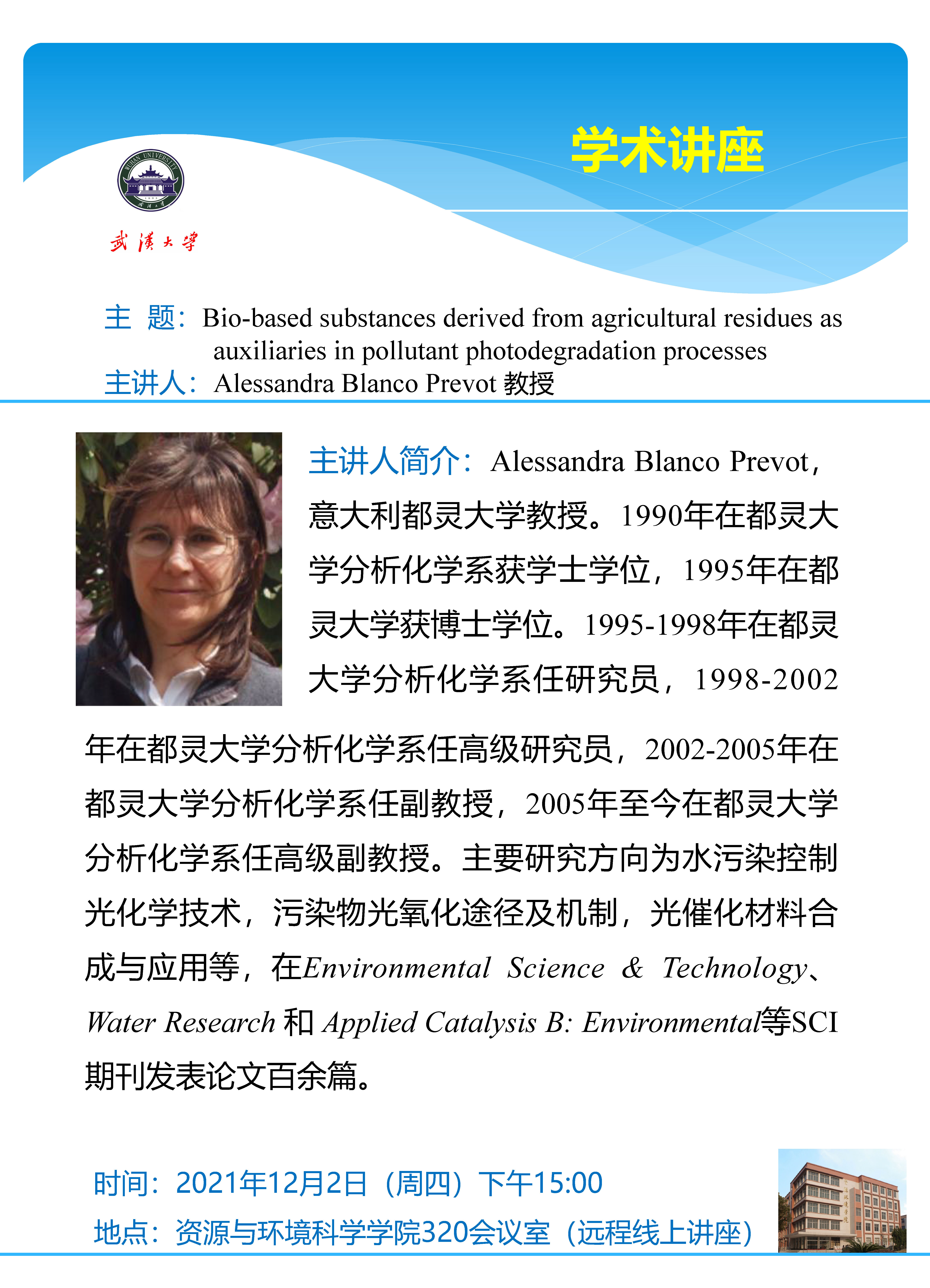 12月2日 珞珈资源环境讲坛第54讲:Bio-based substances derived from agricultural residues as auxiliaries in pollutant photodegradation processes