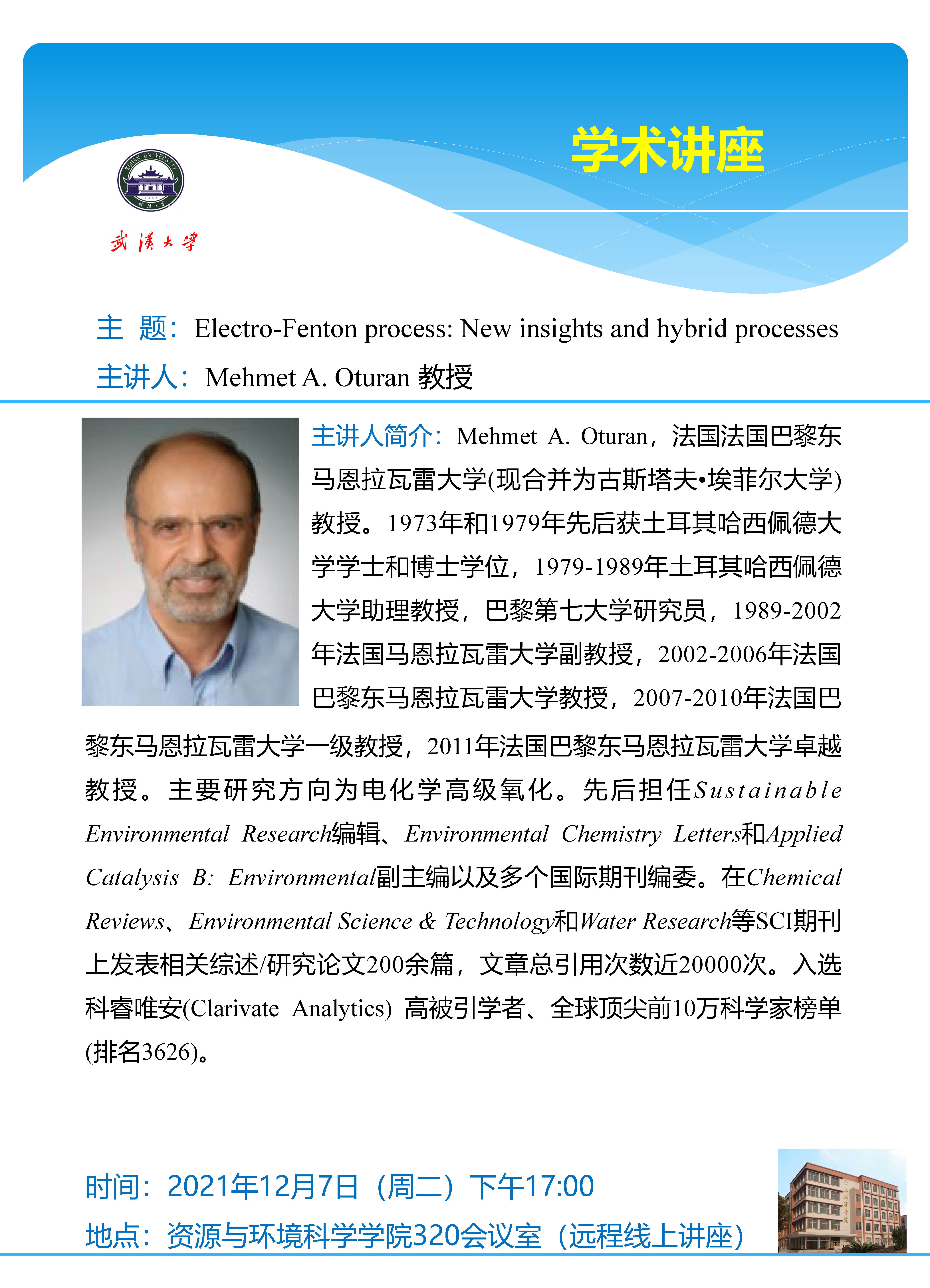 12月7日 珞珈资源环境讲坛第57讲 Electro-Fenton process: New insights and hybrid processes