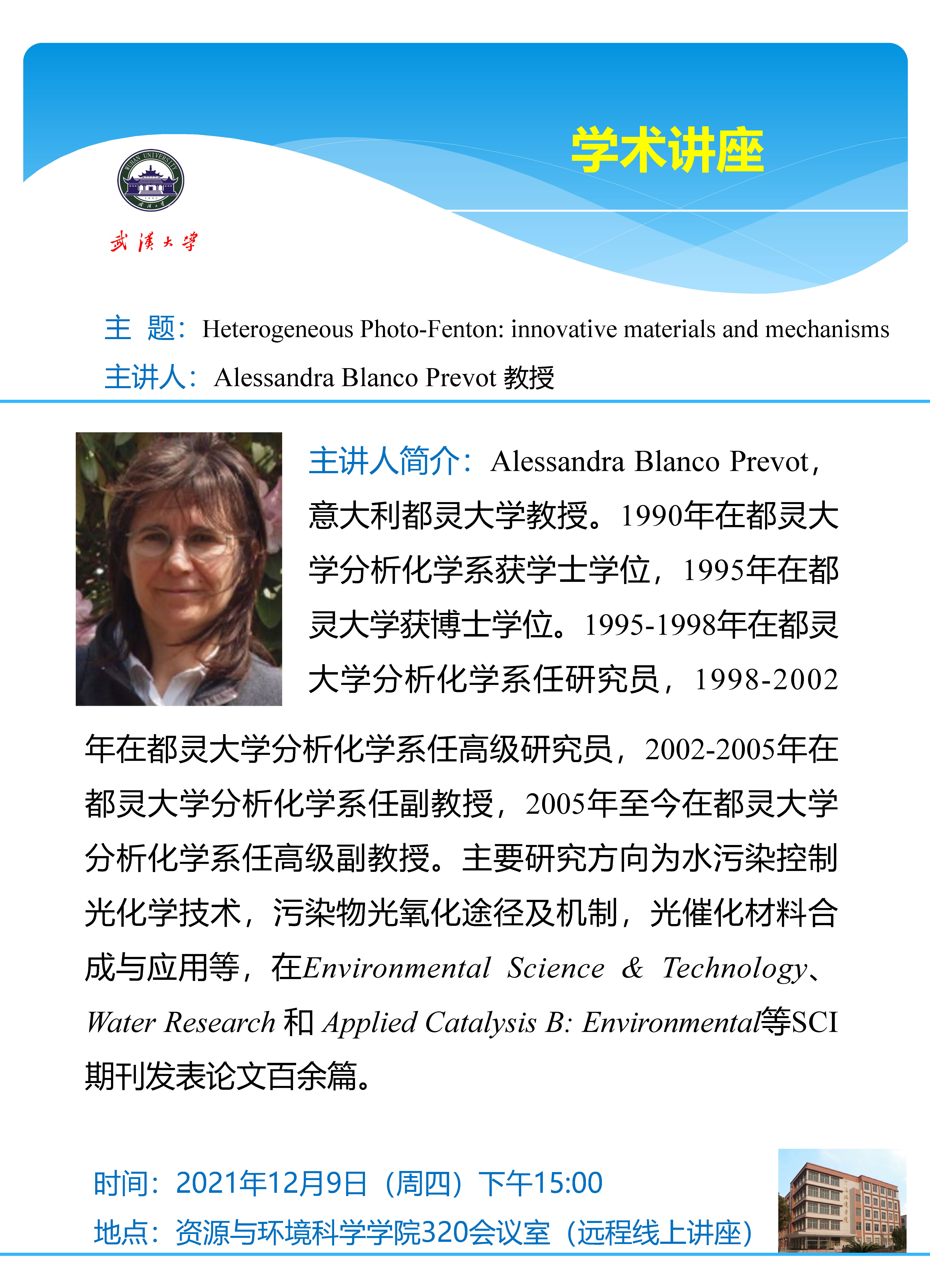 12月9日 珞珈资源环境讲坛第58讲 Heterogeneous Photo-Fenton: innovative materials and mechanisms