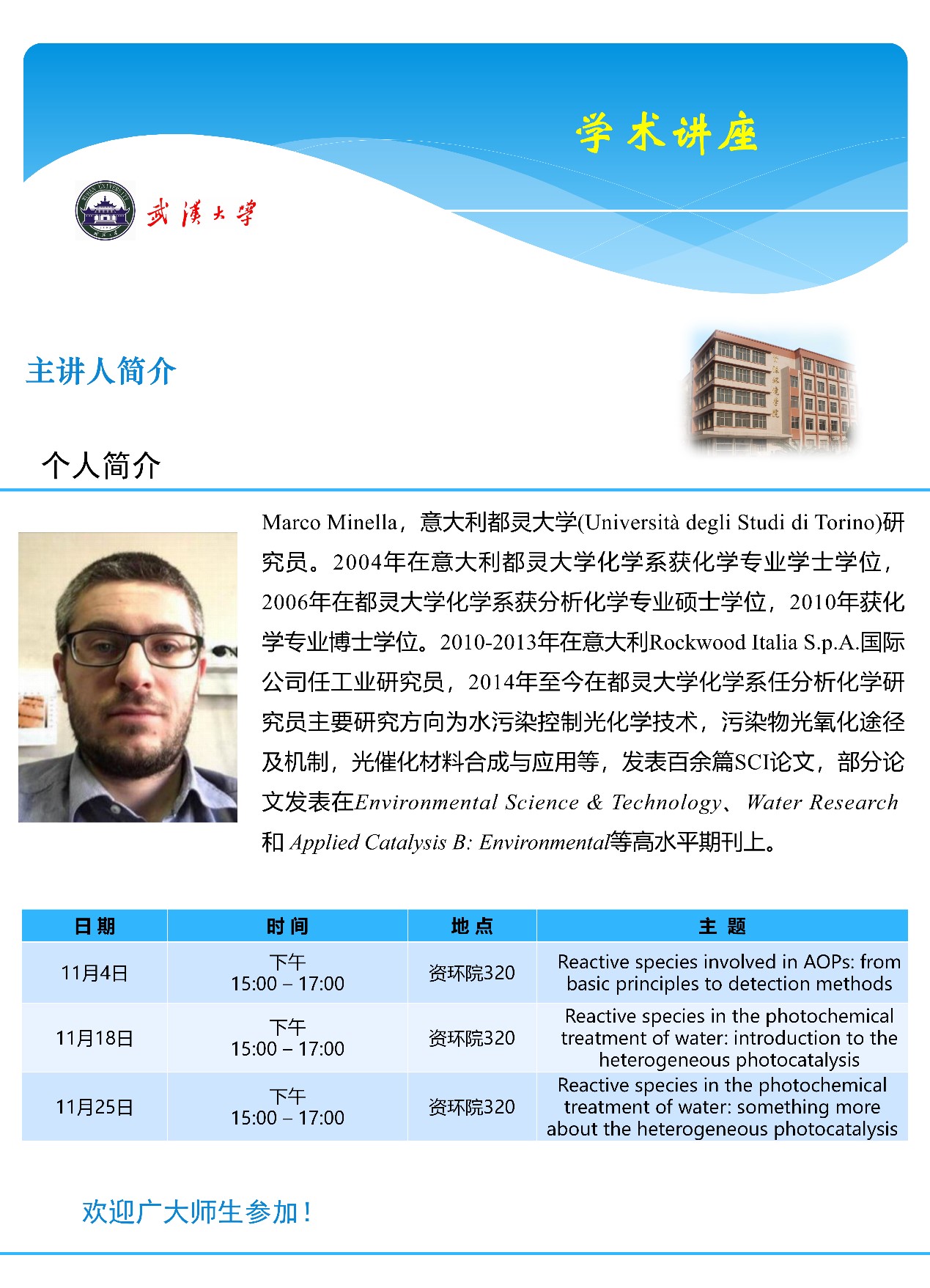 2021年11月4日至11月25日,应老王论坛 张晖教授的邀请,意大利都灵大学教授Marco Minella老师为学院硕士及博士研究生开展了3次光催化反应在高级氧化技术方面的应用的课程讲座。
