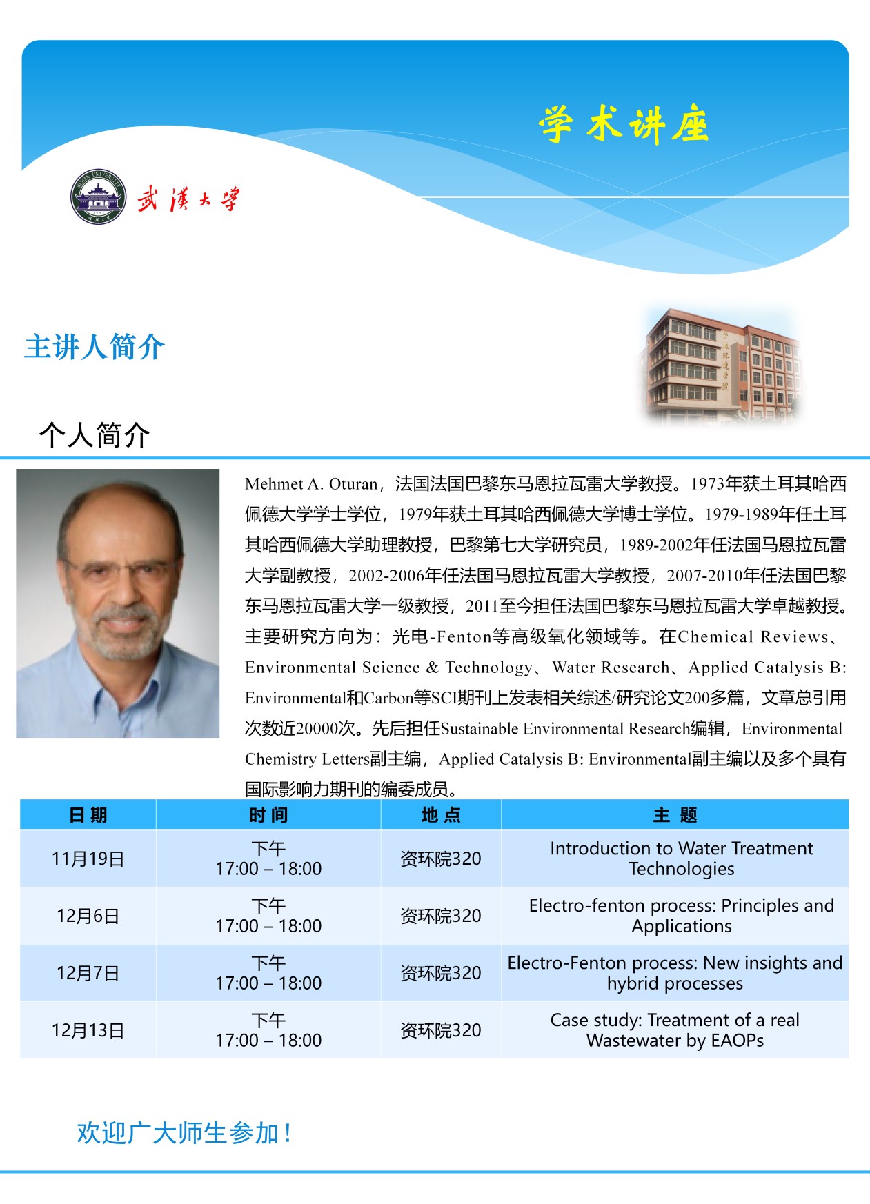 2021年11月19日至12月13日,应老王论坛 张晖教授的邀请,法国巴黎东马恩拉瓦雷大学终身教授Mehmet A. Oturan老师为学院硕士及博士研究生开展了4次高级氧化技术方面的课程讲座。