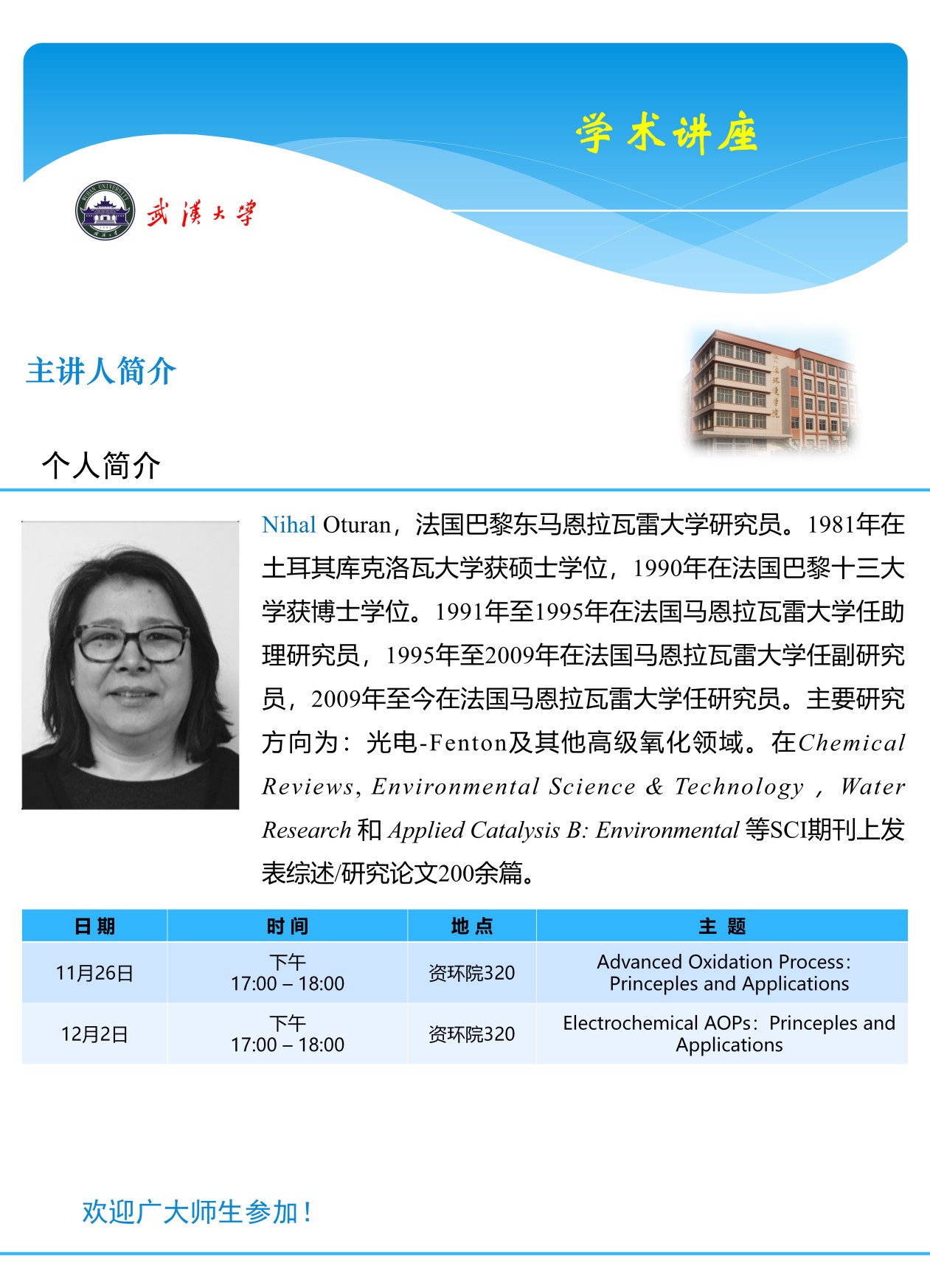 2021年11月26日至12月2日,应老王论坛 张晖教授的邀请,法国巴黎东马恩拉瓦雷大学研究员Nihal Oturan老师为学院本科生开展了2次高级氧化技术方面的课程讲座。